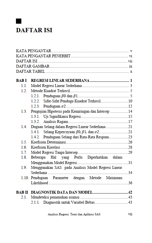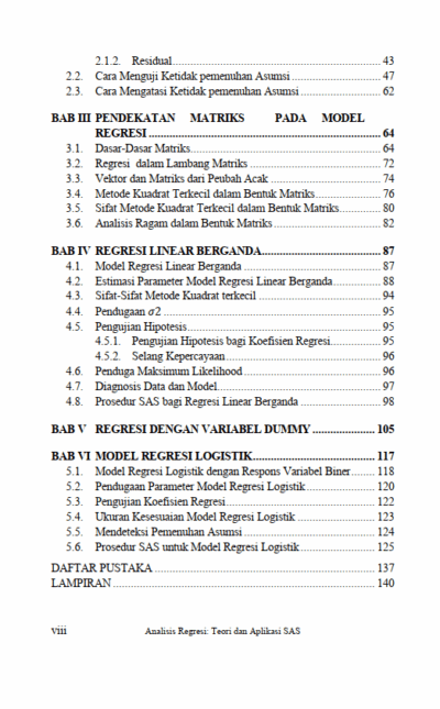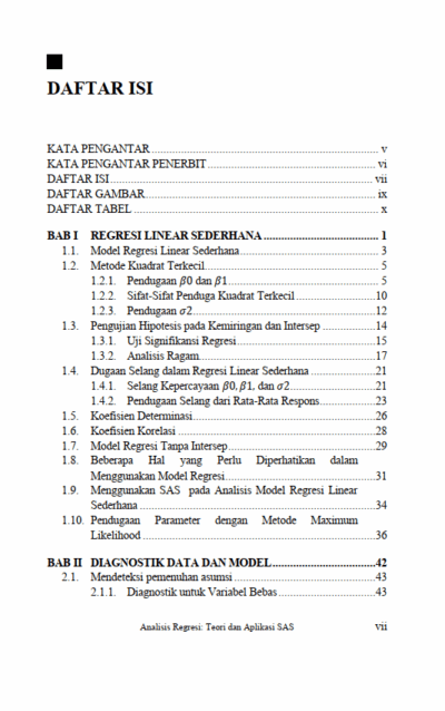 Berikut Daftar Isi Buku Statistika yang berjudul Buku Analisis Regresi: Teori dan Aplikasi SAS, diantaranya: