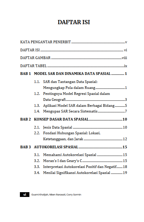 Buku Geografi yang berjudul Buku Buku Analisis Spasial untuk Pemula Hingga Praktisi merupakan karya Gusmi Kholijah, Niken Rarasati dan Corry Sormin. Fenomena spasial sering kali tidak berdiri sendiri. Suatu kejadian yang terjadi di satu wilayah cenderung memiliki hubungan atau keterkaitan dengan wilayah lain yang berdekatan. Hubungan antarwilayah atau ketergantungan spasial ini dalam statistika dikenal sebagai autokorelasi spasial. Ketika autokorelasi ini diabaikan dalam analisis, maka hasil yang diperoleh bisa bias atau tidak akurat. Untuk itu, dikembangkanlah model-model statistika khusus yang mampu merepresentasikan ketergantungan antar lokasi secara matematis, salah satunya adalah model Spatial Autoregressive (SAR). Model SAR merupakan salah satu pendekatan dalam regresi spasial yang memperhitungkan efek pengaruh dari lokasi-lokasi tetangga dalam model prediksi. Dalam SAR, nilai variabel dependen di suatu lokasi dipengaruhi tidak hanya oleh variabel-variabel independen (bebas) di lokasi tersebut, tetapi juga oleh nilai variabel dependen dari lokasi-lokasi yang berdekatan secara spasial. Dengan demikian, SAR mampu memberikan pemodelan yang lebih realistis dan akurat dalam kasus-kasus yang memiliki struktur spasial.