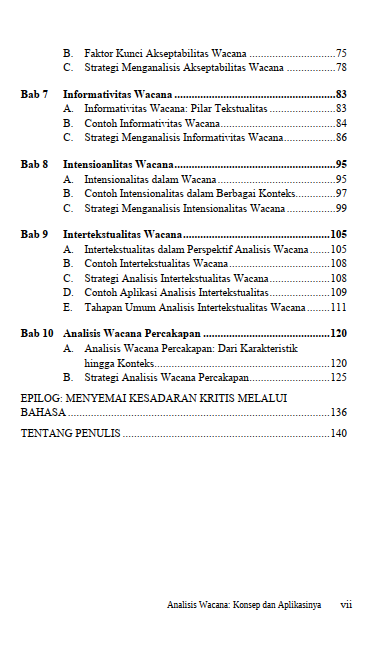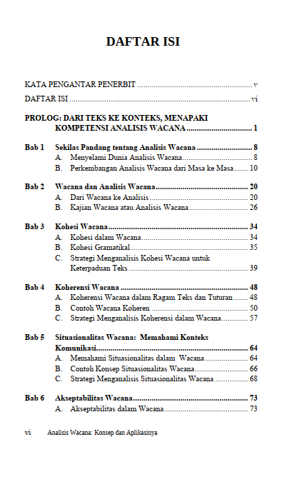 Berikut Daftar Isi Buku Bahasa dan Sastra yang berjudul Buku Analisis Wacana: Konsep dan Aplikasinya, diantaranya: