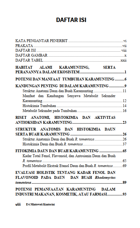 Berikut Daftar Isi Buku Biologi yang berjudul Buku Anatomi Dan Fitokimia Karamunting (Rhodomyrtus tomentosa (Aiton) Hassk.), diantaranya: