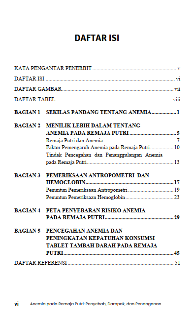Berikut Daftar Isi Buku Kesehatan yang berjudul Buku Anemia pada Remaja Putri: Penyebab, Dampak dan Penanganan, diantaranya: