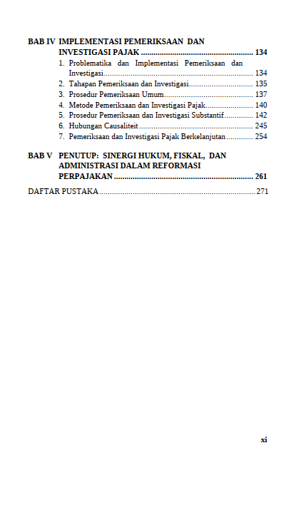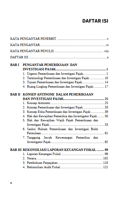 Berikut Daftar Isi Buku Perpajakan yang berjudul Buku Antinomi Investigasi dan Pemeriksaan Pajak Suatu Tinjauan atas Prinsip-Prinsip Yuridis Fiskal Edisi Terkini, diantaranya: