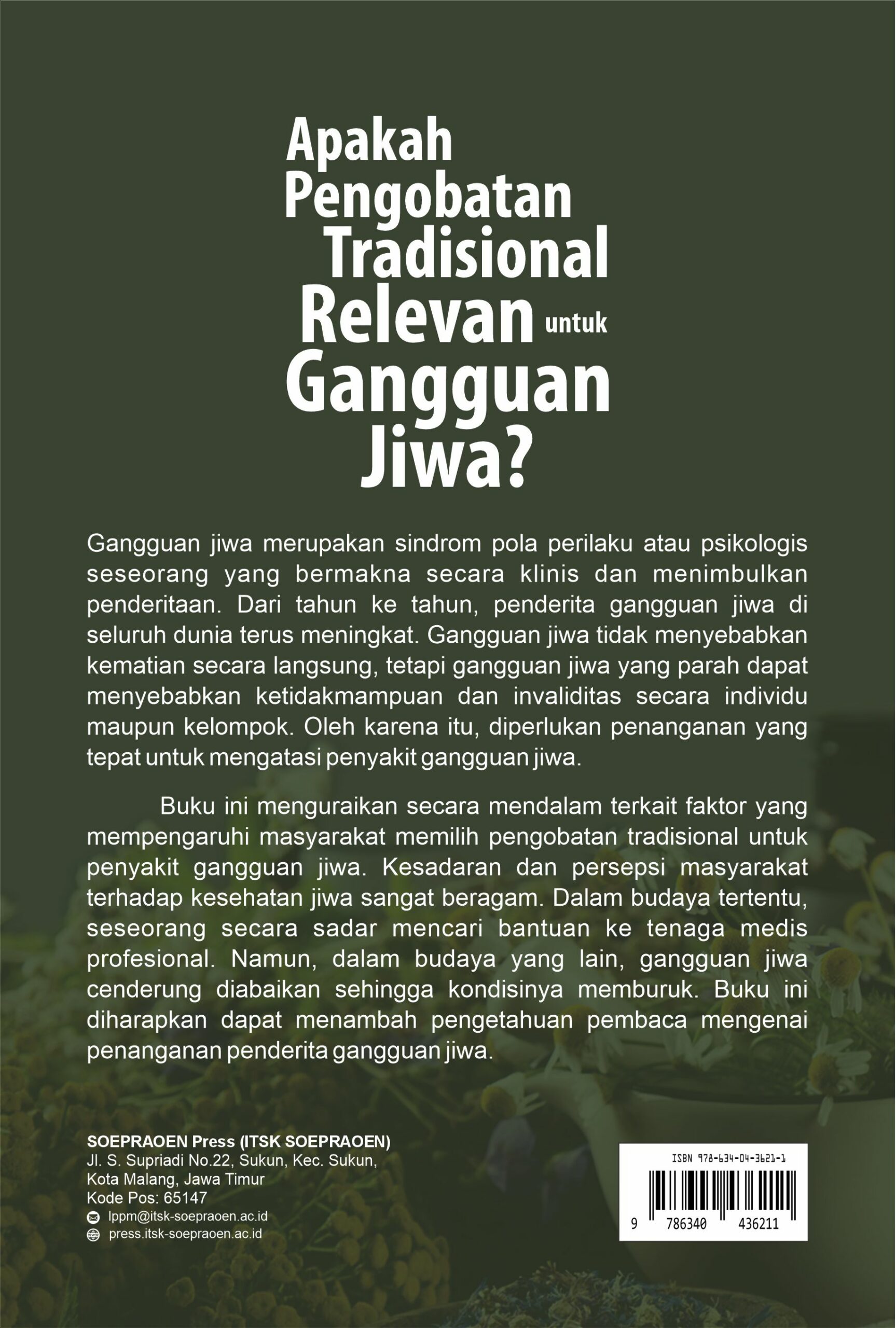 Kesadaran dan persepsi masyarakat terhadap kesehatan jiwa sangat beragam. Dalam budaya tertentu, seseorang secara sadar mencari bantuan ke tenaga medis profesional. Namun, dalam budaya yang lain, gangguan jiwa cenderung diabaikan sehingga kondisinya memburuk. Buku ini diharapkan dapat menambah pengetahuan pembaca mengenai penanganan penderita gangguan jiwa. Buku Apakah Pengobatan Tradisional Relevan untuk Gangguan Jiwa? sangat cocok bagi para peneliti, mahasiswa, dan praktisi di bidang keperawatan dan kesehatan yang ingin mendalami pengobatan tradisional untuk penyakit gangguan jiwa.