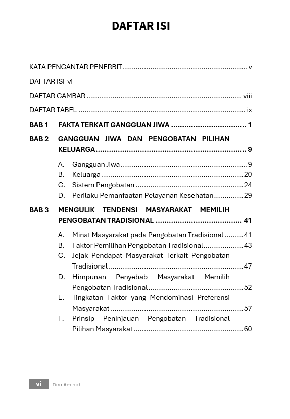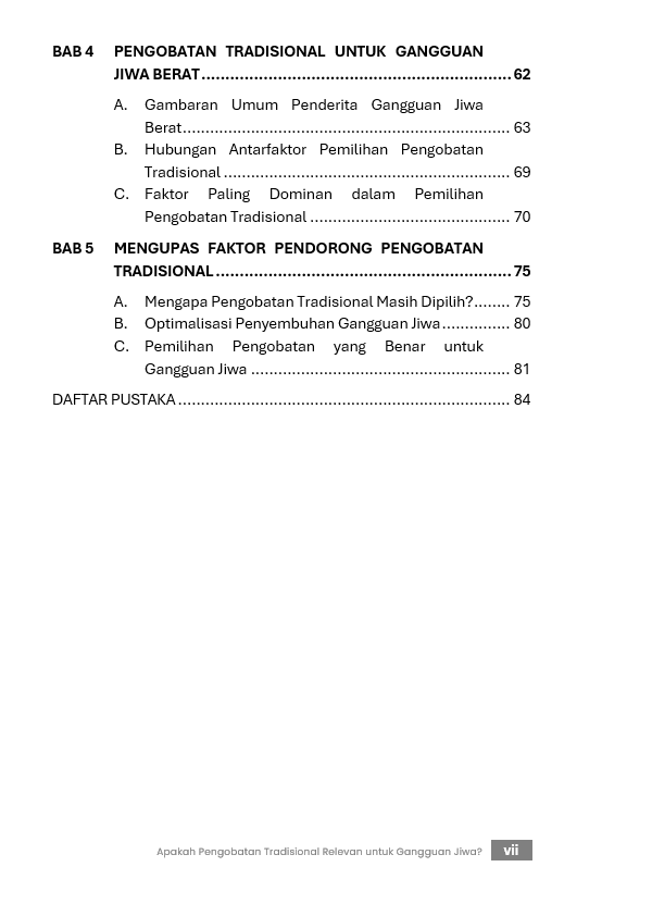 Berikut Daftar Isi Buku Kesehatan yang berjudul Buku Apakah Pengobatan Tradisional Relevan untuk Gangguan Jiwa?, diantaranya: