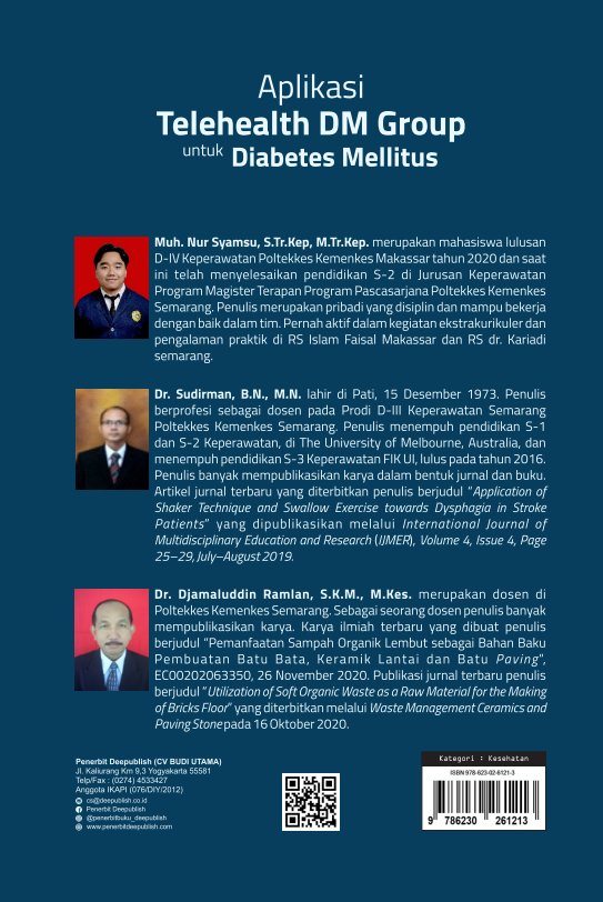 Buku Kesehatan yang berjudul Buku Aplikasi Telehealth DM Group untuk Diabetes Mellitus merupakan karya Muh. Nur Syamsu, Sudirman dan Djamaluddin Ramlan. Penatalaksanaan perawatan diri merupakan hal terpenting dalam pengendalian diabetes, namun beberapa masalah telah disebutkan dalam beberapa literatur, yaitu pasien diabetes mellitus tipe 2 memiliki tingkat penatalaksanaan perawatan diri yang rendah. endahnya manajemen diri pada pasien diabetes mellitus tipe 2 disebabkan oleh banyak faktor, salah satunya psikologis. Tingkat perawatan diri yang rendah akan meningkatkan insiden komplikasi. Banyak pasien merasa sulit untuk mengatur diri sendiri, yang menyebabkan kontrol gula darah yang buruk. Berdasarkan hasil penelitian sebelumnya menunjukkan hanya 20% pasien DM yang mampu menerapkan perawatan diri. Hal tersebut menyebabkan komplikasi seperti: gagal ginjal kronis, retinopati, neuropati dan penyakit kardiovaskular. Manajemen diri pada pasien DM merupakan upaya penting dalam mengontrol kadar gula darah dan menekan komplikasi, baik mikro maupun makrovaskuler. Oleh karna itu, di era modernisasi ini perlu adanya upaya dalam membantu pasien DM mengontrol kadar gula darahnya, seperti penggunaan teknologi dalam meningkatkan manajemen kontrol gula darah, seperti Telehealth.