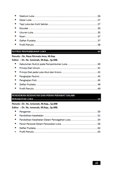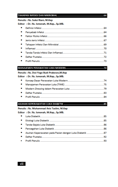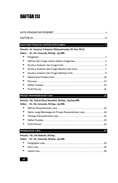 Sinopsis Buku Asuhan Keperawatan Luka Buku Asuhan Keperawatan Luka Buku Keperawatan yang berjudul Buku Asuhan Keperawatan Luka merupakan karya Swanny Trikajanti Widyaatmadja, dkk. Luka adalah kerusakan pada kulit yang dapat disebabkan oleh berbagai faktor, seperti trauma fisik, paparan bahan kimia, atau suhu ekstrem. Ketika kulit terluka, fungsi perlindungan tubuh terganggu. Proses penyembuhan luka melibatkan serangkaian reaksi kompleks dalam tubuh, mulai dari pembekuan darah hingga pembentukan jaringan baru. Kecepatan dan kualitas penyembuhan luka dipengaruhi oleh berbagai faktor, termasuk lokasi luka, tingkat keparahan, dan kondisi kesehatan umum individu. Kulit bukan hanya pelindung, tetapi juga cerminan dari kesehatan dan vitalitas kita. Dalam konteks keperawatan luka, memahami anatomi dan fisiologi kulit adalah kunci untuk merawat mereka yang mengalami luka dan cedera. Setiap luka bukan hanya kerusakan fisik, tetapi juga memengaruhi kualitas hidup dan kesejahteraan psikologis seseorang. Proses penyembuhan luka secara umum terbagi menjadi beberapa fase, yaitu hemostasis (pembekuan darah), peradangan, proliferasi (pembentukan jaringan baru), dan remodeling (pematangan jaringan). Agar proses penyembuhan berjalan lancar, keempat fase ini harus terjadi secara berurutan dan seimbang. Namun, berbagai faktor seperti usia, nutrisi, penyakit penyerta, dan jenis luka dapat mengganggu proses penyembuhan. Oleh karena itu, peran perawat dalam merawat luka adalah sebuah misi mulia yang membantu pasien mendapatkan kembali integritas kulit mereka, dan dengan itu, sebagian dari harga diri dan kenyamanan mereka. Berikut Daftar Isi Buku Keperawatan yang berjudul Buku Asuhan Keperawatan Luka, diantaranya: