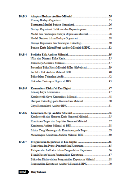 Buku Manajemen yang berjudul Buku Auditor Milenial di Era Digital merupakan karya Hery Subowo. Pelaksanaan standar dan metodologi pemeriksaan memerlukan pertimbangan profesional dari para pemeriksa, yang bergantung pada kondisi objek pemeriksaan yang beragam. Pertimbangan ini meliputi keputusan tentang sampling, kecukupan bukti, analisis masalah, dan sebagainya. Keahlian dalam menggunakan pertimbangan profesional merupakan salah satu bentuk nyata pengambilan keputusan oleh para pemeriksa. Kualitas keputusan dalam setiap prosedur pemeriksaan sangat bergantung pada komitmen setiap pemeriksa terhadap tugas yang diberikan.