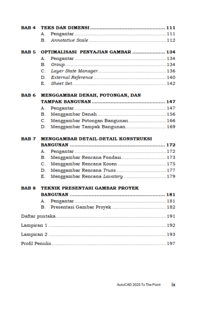 Buku AutoCAD 2025 To The Point Cara Praktis dan Mahir Menggambar Proyek Bangunan Buku Ilmu Komputer yang berjudul Buku AutoCAD 2025 To The Point Cara Praktis dan Mahir Menggambar Proyek Bangunan merupakan karya Triono Subagio. AutoCAD, salah satu program grafis komputer telah menjadi alat bantu di bidang desain yang sangat populer saat ini. Kemampuan autoCAD dalam hal tingkat presisi yang tinggi sangat diandalkan para engineer untuk membantu menyelesaikan pekerjaannya. Buku ini hadir untuk mencapai maksud tersebut. Dengan mengandalkan kemampuan autoCAD secara maksimal, seorang perencana bisa menghadirkan gambar dengan lebih akurat, lebih dari sekadar gambar desain yang dibuat dan dicetak dengan alat bantu komputer. Konsep yang dihadirkan melalui buku ini adalah mengoperasikan autoCAD melalui masukan perintah-perintah menggunakan keyboard. Dalam buku ini Anda belajar untuk menyelesaikan gambar-gambar proyek bangunan sederhana sampai dengan cara menyajikan gambar-gambar tersebut dengan mudah. Berikut Daftar Isi Buku Ilmu Komputer yang berjudul Buku AutoCAD 2025 To The Point Cara Praktis dan Mahir Menggambar Proyek Bangunan, diantaranya: