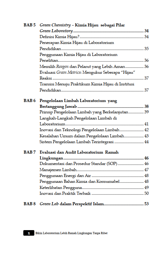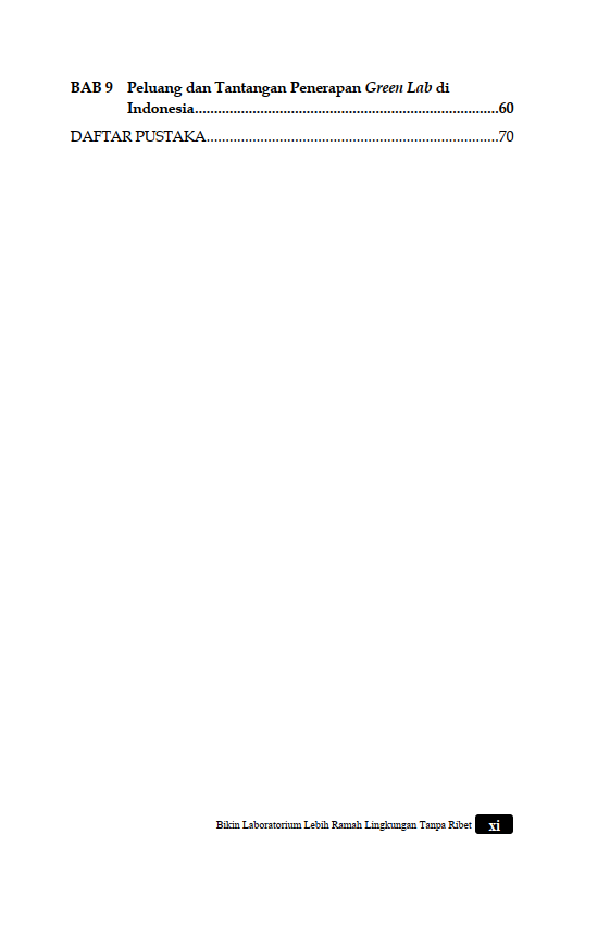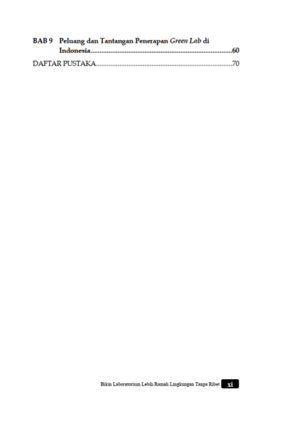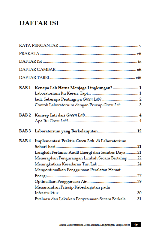 Berikut Daftar Isi Buku Sains dan Teknologi yang berjudul Buku Bikin Laboratorium Lebih Ramah Lingkungan Tanpa Ribet, diantaranya: