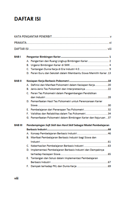 Berikut Daftar Isi Buku Pendidikan yang berjudul Buku Bimbingan Karier: Mempersiapkan Generasi Unggul untuk Dunia Kerja di Era Industri 4.0, diantaranya: