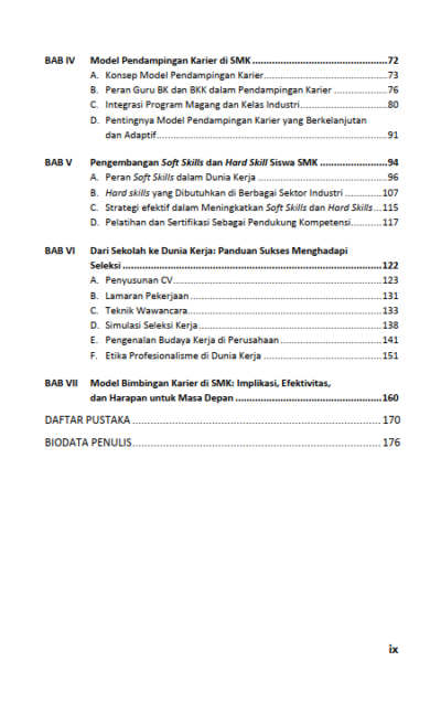 Dengan menyoroti praktik baik di lingkungan SMK, seperti Teaching Factory, Student On Duty, dan Casual On Call, buku ini menawarkan solusi aplikatif dalam menjembatani dunia pendidikan dan industri. Buku ini juga menegaskan pentingnya peran Bursa Kerja Khusus (BKK) dan layanan Bimbingan Konseling (BK) dalam memfasilitasi transisi siswa menuju dunia kerja secara lebih terstruktur dan profesional. Diharapkan, buku ini menjadi inspirasi dan referensi bagi semua pihak yang terlibat dalam pengembangan karier generasi muda Indonesia agar mampu bersaing secara global di era Revolusi Industri 4.0.
