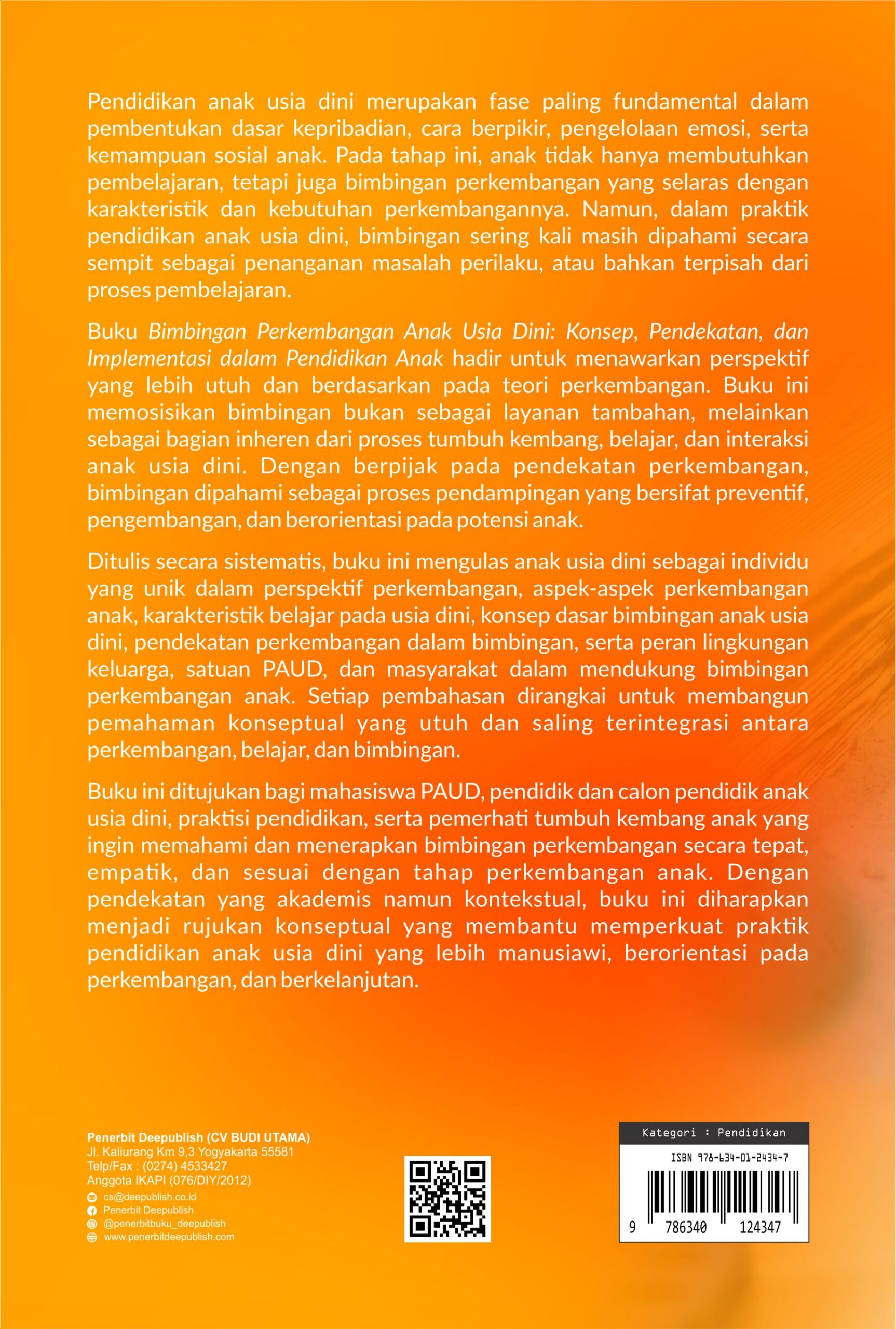 Buku Bimbingan Perkembangan Anak Usia Dini: Konsep, Pendekatan, dan Implementasi dalam Pendidikan Anak diterbitkan oleh Penerbit Buku Pendidikan Deepublish.