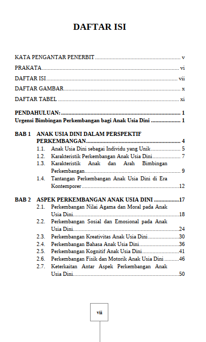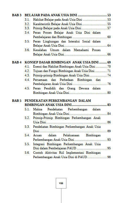 Ditulis secara sistematis, buku ini mengulas anak usia dini sebagai individu yang unik dalam perspektif perkembangan, aspek-aspek perkembangan anak, karakteristik belajar pada usia dini, konsep dasar bimbingan anak usia dini, pendekatan perkembangan dalam bimbingan, serta peran lingkungan keluarga, satuan PAUD, dan masyarakat dalam mendukung bimbingan perkembangan anak. Setiap pembahasan dirangkai untuk membangun pemahaman konseptual yang utuh dan saling terintegrasi antara perkembangan, belajar, dan bimbingan.