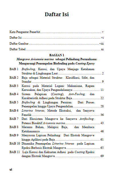 Mangrove bukan sekadar vegetasi pesisir yang tumbuh di batas darat dan laut. Ia adalah benteng alami yang bekerja senyap, yakni melindungi permukaan, menahan laju degradasi, dan membentuk interaksi kompleks dengan lingkungannya. Buku ini membuka pembahasan dari peran Avicennia marina sebagai agen alami yang berkontribusi dalam mengurangi penempelan organisme laut pada permukaan berlapis, sekaligus menghadirkan sudut pandang baru tentang relasi antara ekosistem mangrove dan ketahanan material di wilayah pesisir.