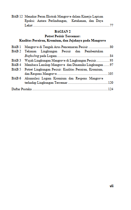 Buku ini mengajak pembaca menelusuri wajah pesisir yang terpapar tekanan pencemaran. Kualitas perairan, keberadaan kromium, serta jejaknya pada air, sedimen, dan jaringan mangrove diuraikan secara runtut dan kontekstual. Mangrove tampil bukan hanya sebagai pelindung, tetapi juga sebagai saksi ekologis yang merekam dinamika pencemaran pesisir secara perlahan namun pasti.