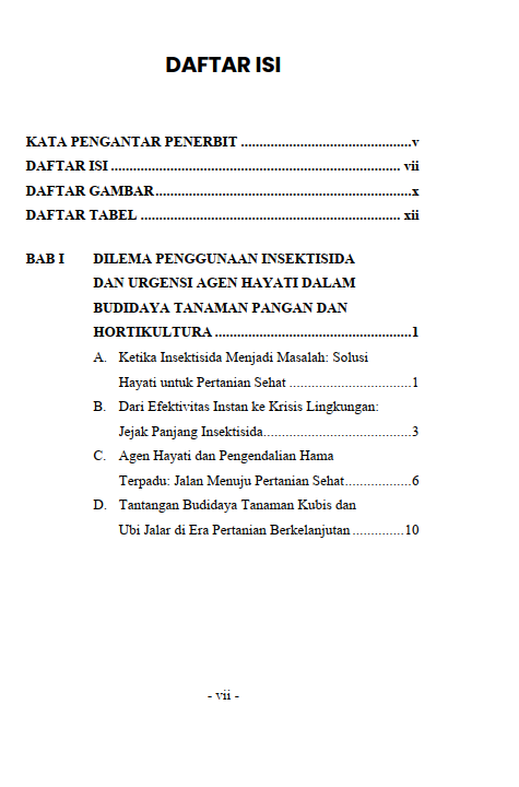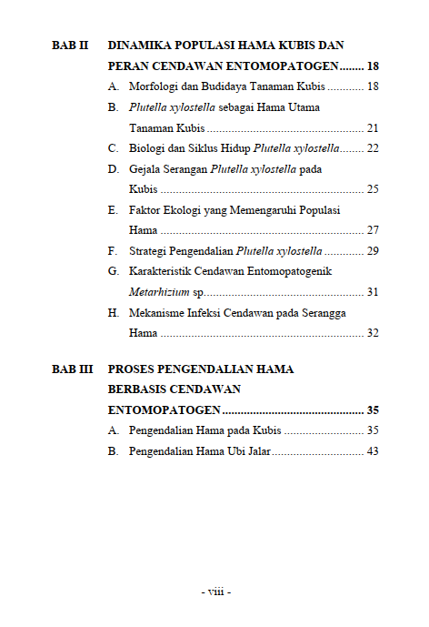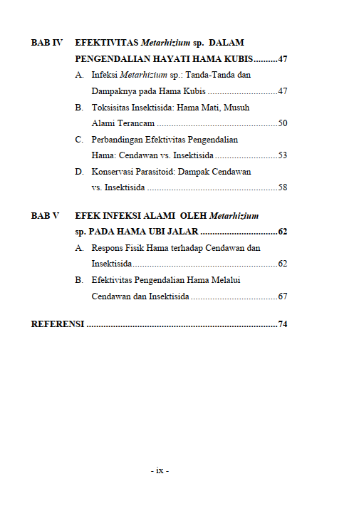 Berikut Daftar Isi Buku Pertanian yang berjudul Buku Bioinsektisida Masa Depan: Efektivitas Metarhizium sp. Isolat Lokal pada Pertanian Hortikultura dan Pangan, diantaranya: