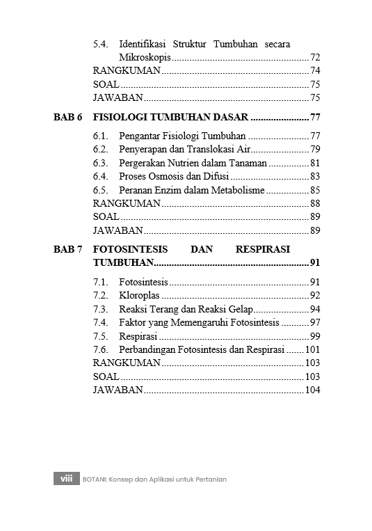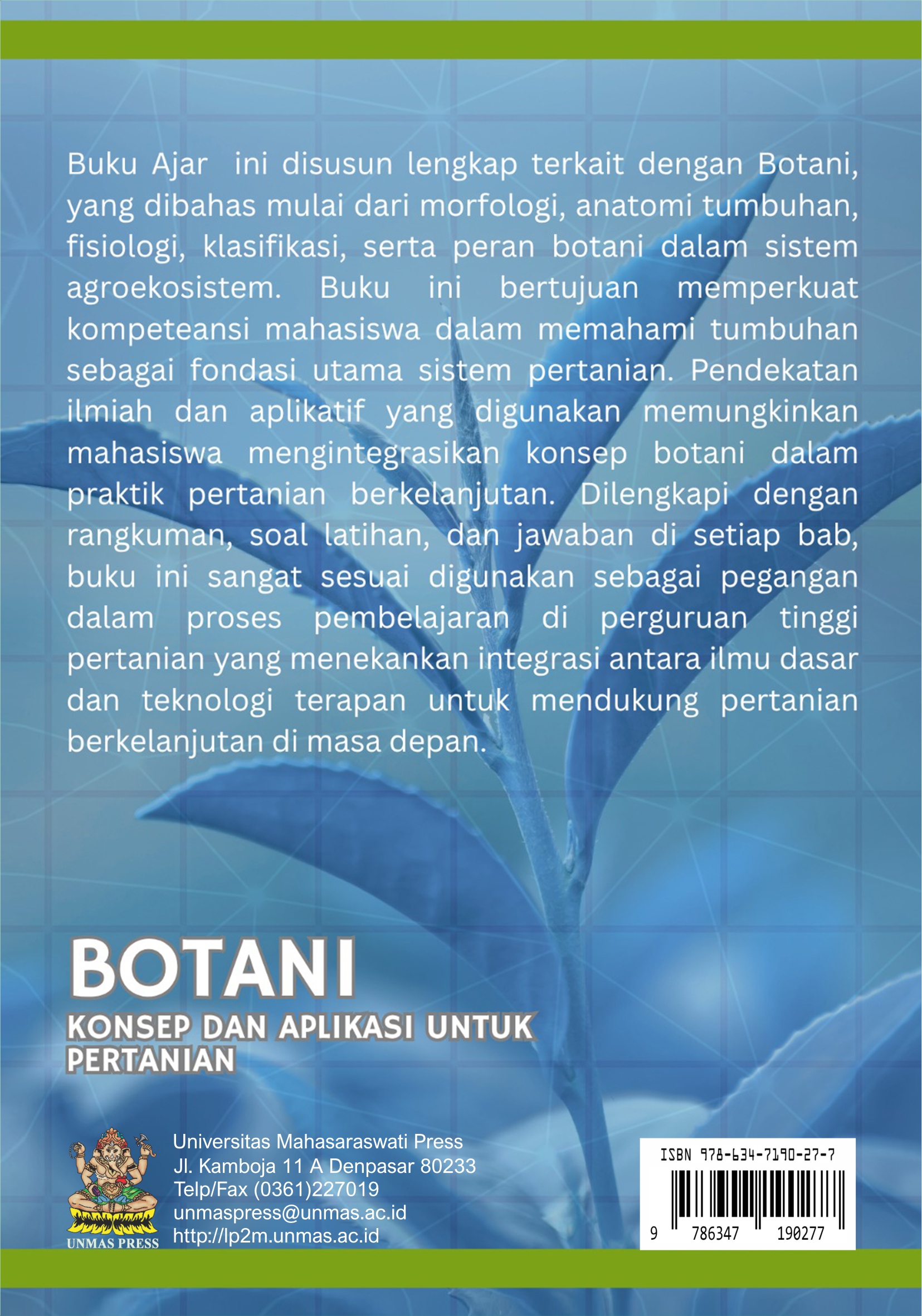 Pembahasan diawali dengan menjelaskan struktur morfologi dan anatomi tumbuhan, dilanjutkan dengan fungsi-fungsi fisiologis dasar yang menopang kehidupan tumbuhan. Buku ini juga mengupas klasifikasi tumbuhan secara terstruktur, serta menyoroti keanekaragaman dan peranan vital tumbuhan dalam ekosistem dan bidang pertanian. Buku Botani: Konsep dan Aplikasi untuk Pertanian sangat cocok bagi para peneliti, mahasiswa, dan praktisi di bidang pertanian yang ingin mengetahui lebih dalam mengenai berbagai aspek penting dalam ilmu botani.