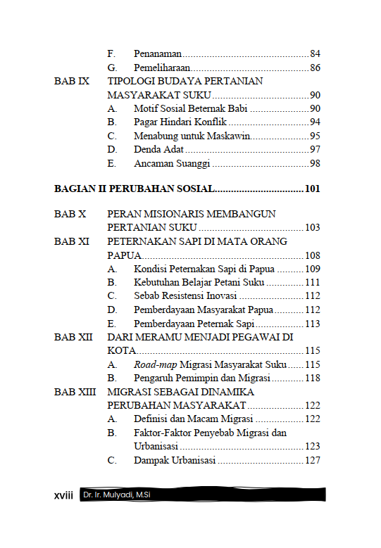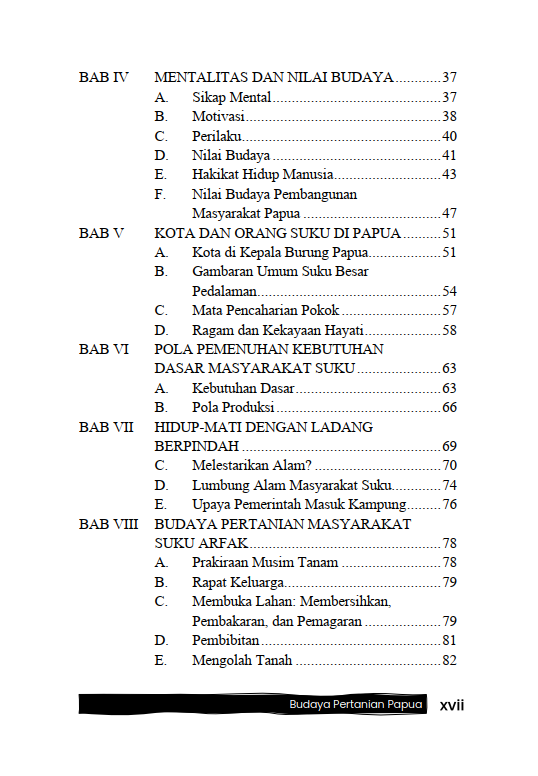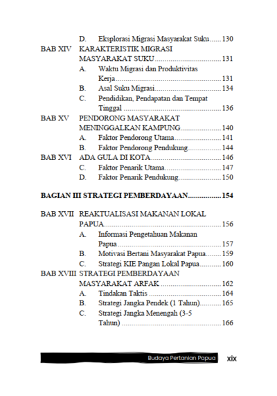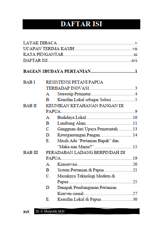 Sinopsis Buku Budaya Pertanian Papua Buku Budaya Pertanian Papua Buku Pertanian yang berjudul Buku Budaya Pertanian Papua merupakan karya Mulyadi. Pemberdayaan merupakan proses komprehensif yang tidak hanya berfokus pada individu, tetapi juga pada pengembangan kapasitas usaha, lingkungan, dan kelembagaan. Tujuannya adalah menciptakan kondisi yang memungkinkan masyarakat dapat meningkatkan kesejahteraan hidupnya secara berkelanjutan. Kelembagaan yang kuat menjadi kunci keberhasilan upaya pemberdayaan karena dapat menjamin keberlanjutan dari perubahan yang dihasilkan. Buku ini menggarisbawahi pentingnya kearifan lokal dalam upaya meningkatkan ketahanan pangan di Papua. Masyarakat Papua memiliki sistem pangan yang unik dan kuat, tetapi sering kali menolak upaya pembaruan yang bertentangan dengan nilai-nilai mereka. Selain itu, buku ini juga mencatat kontribusi positif misionaris dalam pemberdayaan masyarakat Papua, terutama dalam bidang pendidikan, kesehatan, dan pengorganisasian masyarakat. Berikut Daftar Isi Buku Pertanian yang berjudul Buku Budaya Pertanian Papua, diantaranya: