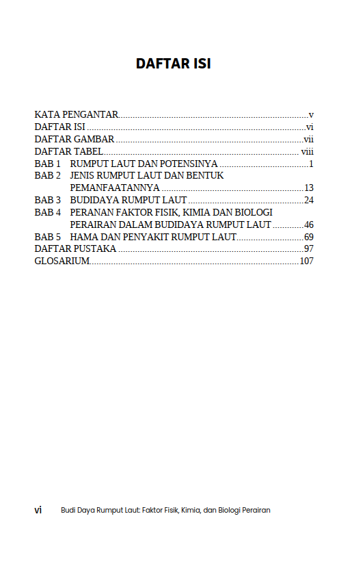 Berikut Daftar Isi Buku Perikanan dan Kelautan yang berjudul Buku Budi Daya Rumput Laut: Faktor Fisik, Kimia, dan Biologi Perairan, diantaranya: