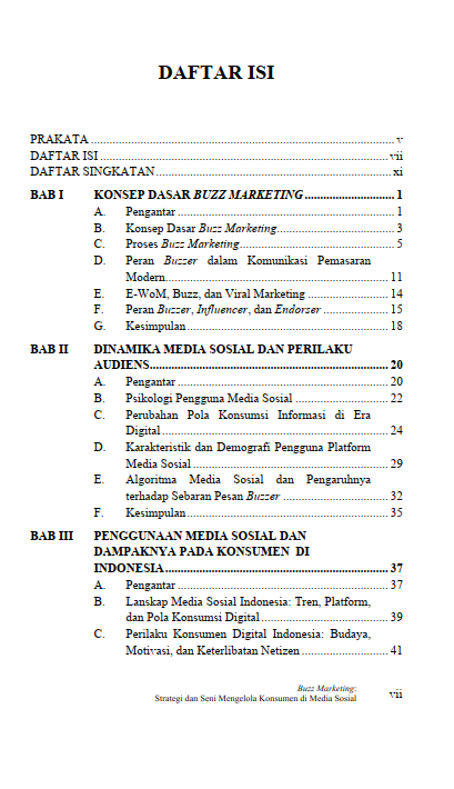 Berikut Daftar Isi Buku Bisnis yang berjudul Buku Buzz Marketing: Strategi dan Seni Mengelola Konsumen Di Media Sosial, diantaranya: