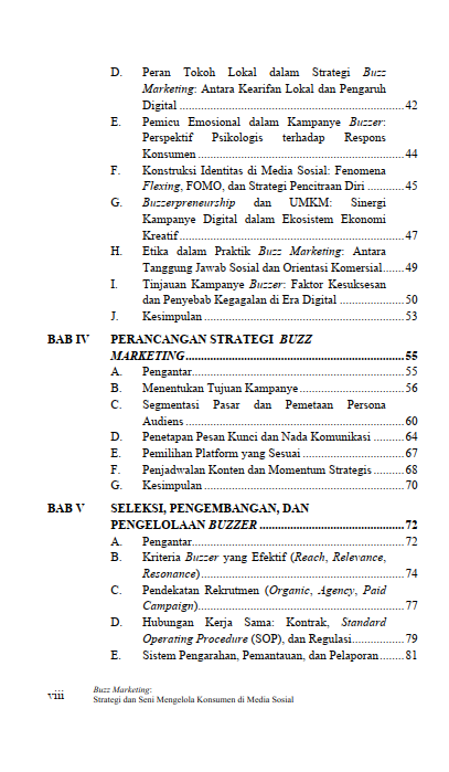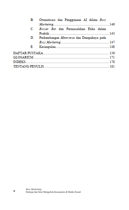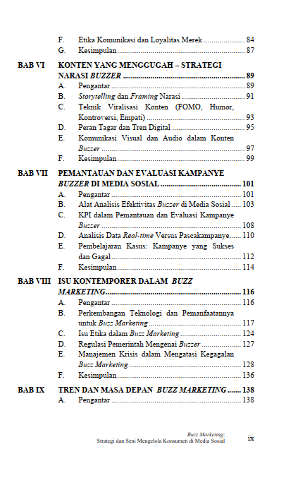 Buku ini membahas penggunaan buzzer dalam komunikasi pemasaran kontemporer serta konsep dasar dan dinamika media sosial. Melalui dasar buzz marketing, dinamika media sosial dan perilaku audiens, pembaca dapat mempelajari bagaimana perubahan perilaku konsumen dan algoritma platform digital berdampak pada strategi pemasaran. Buku ini juga membahas strategi praktis dalam perancangan buzz marketing, pengelolaan buzzer, hingga konten yang menggugah sebagai strategi narasi buzzer. Setiap bab menawarkan cara untuk menampilkan konten yang kreatif dalam menangani buzzer secara profesional dan meningkatkan efektivitas perusahaan. Isu-isu kontemporer juga dibahas, mulai dari etika dan regulasi pemerintah hingga manajemen krisis. Buku Buzz Marketing: Strategi dan Seni Mengelola Konsumen Di Media Sosial sangat cocok bagi akademisi, praktisi, dan pakar komunikasi serta pebisnis untukmemahami strategi buzz marketing yang efektif, efisien, dan komprehensif.