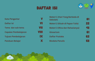 Sinopsis Buku Cahaya Ilmu Di Sudut Kota Buku Cahaya Ilmu Di Sudut Kota Dika, seorang siswa SD cemerlang yang selalu ceria tetapi sering merasa kesulitan dalam pelajaran matematika. Suatu hari, Pak Ardi guru matematika yang terkenal sangat tegas, memberikan materi tentang pembagian. Dika kebingungan dan tidak bisa mengerjakan soal-soal. Pak Ardi dengan sabar membantu Dika cara membagi angka, seperti membagi apel dalam keranjang. Dika mulai mengerti, hingga akhirnya merasa bahwa matematika tidak sesulit yang ia bayangkan. Dika pulang dengan rasa gembira, dan berkata bahwa hari ini adalah hari yang berbeda. Persaingan antara Iqbal si anak pintar yang selalu menjadi bintang kelas dengan Faris yang dikenal sebagai anak  cerdik dan punya ide-ide kreatif semakin memanas. Suatu hari Pak Amir mengumumkan akan ada lomba mengerjakan soal di papan tulis. Semua mengira Iqbal yang akan menjadi pemenang, namun ternyata Faris juga dapat menyelesaikan soal tersebut tepat waktu. Persaingan semakin memanas, hubungan mereka semakin tegang. Saat istirahat, Pak Amir memanggil Iqbal dan Faris ke ruang guru. Pak Amir menasehati untuk saling meminta maaf. Setelah percakapan itu, Iqbal dan Faris mulai mencoba untuk lebih sering bekerja sama dan menjadi lebih akrab. Rina adalah siswi kelas 5 SD Harapan, anak yang pendiam dan jarang berbicara di kelas. Tetapi Rina memiliki rahasia yang tak diketahui siapa pun. Sore hari ketika teman sekelasnya sibuk berlatih tari dan teater di aula, tanpa sengaja Pak Arif melihat Rina sedang memainkan piano di samping sekolah. Pak Arif pun meminta Rina untuk ikut tampil di acara pentas seni. Hari pentas seni tiba, Rina memainkan lagu “Burung Kecil” dengan indahnya. Semua bertepuk tangan dengan meriah dan memuji penampilan Rina. Sejak saat itu, Rina tidak lagi dianggap sebagai anak yang pendiam, tetapi juga sebagai gadis yang memiliki bakat luar biasa. Berikut Daftar Isi Buku Pendidikan yang berjudul Buku Cahaya Ilmu Di Sudut Kota, diantaranya: