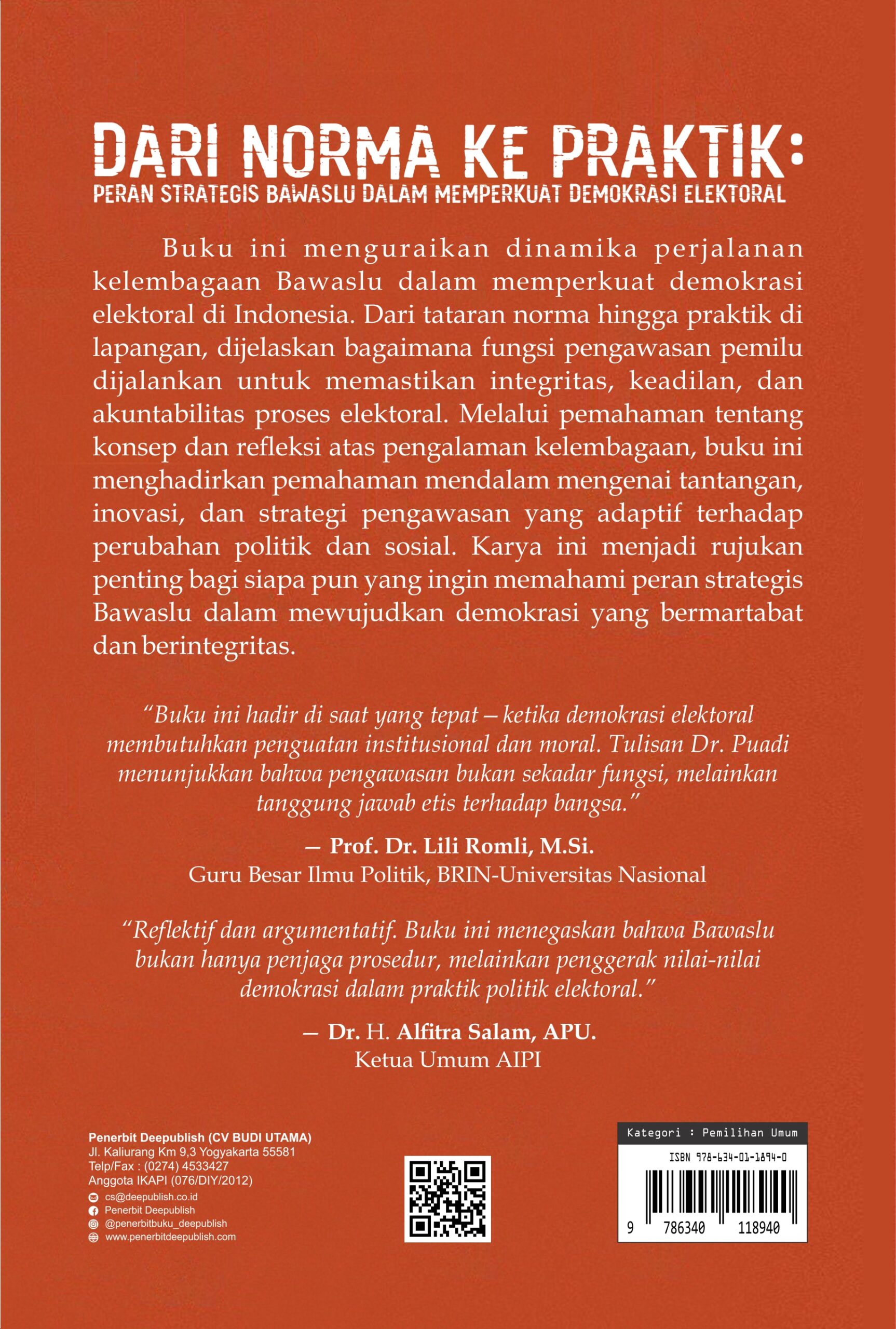 Buku Dari Norma Ke Praktik: Peran Strategis Bawaslu Dalam Memperkuat Demokrasi Elektoral diterbitkan oleh Penerbit Buku Pendidikan Deepublish.