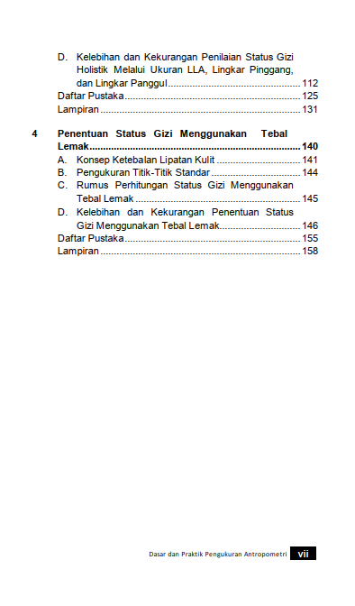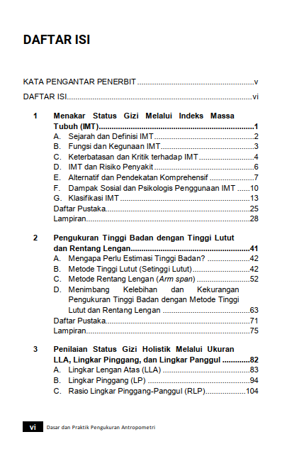 Dilengkapi dengan ilustrasi, contoh aplikasi di bidang kesehatan, gizi, olahraga, dan ergonomi, buku ini membantu pembaca menguasai keterampilan praktis yang sangat dibutuhkan dalam penelitian maupun pelayanan profesional. Dengan uraian materi yang aplikatif dan mudah dipahami, buku ini menjadi referensi penting untuk mendukung penilaian status gizi, perancangan intervensi kesehatan, serta evaluasi pertumbuhan dan kebugaran secara objektif.