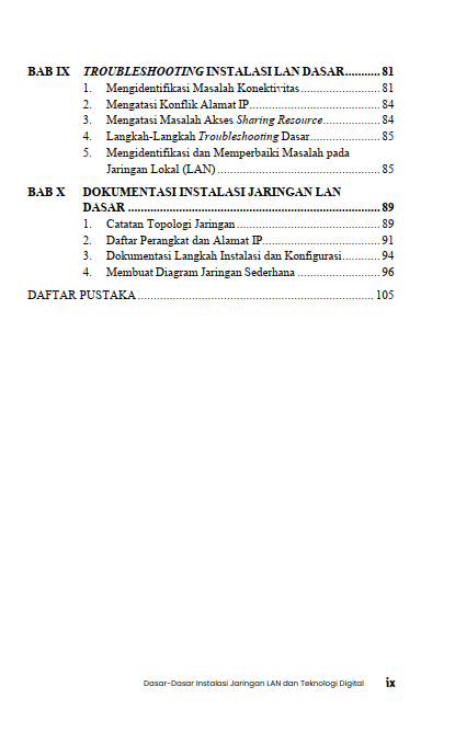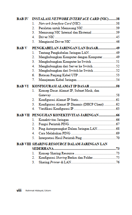 Buku ini memandu Anda secara bertahap dalam konfigurasi kritis, mulai dari pemasangan NIC, penetapan Alamat IP Statis/DHCP, hingga pengujian koneksi menggunakan perintah Ping. Lebih dari itu, Anda akan diajarkan teknik berbagi sumber daya (sharing file dan printer) dan kiat-kiat mengatasi masalah (troubleshooting) dasar yang sering terjadi di lapangan.