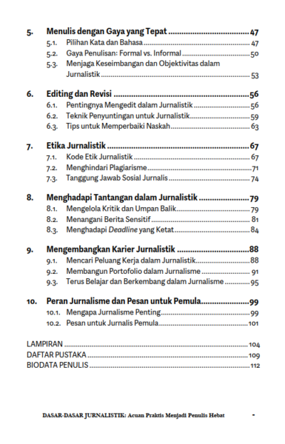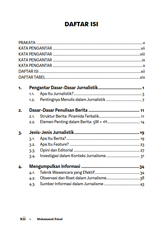 Sinopsis Buku Dasar-Dasar Jurnalistik: Acuan Praktis Menjadi Penulis Hebat Buku Dasar-Dasar Jurnalistik: Acuan Praktis Menjadi Penulis Hebat uku Jurnalistik berjudul Buku Dasar-Dasar Jurnalistik: Acuan Praktis Menjadi Penulis Hebat merupakan karya Muhammad Faisal. Jurnalistik adalah praktik mengumpulkan, mengolah, dan menyebarluaskan informasi kepada publik melalui berbagai media, termasuk surat kabar, majalah, radio, televisi, dan platform digital. Jurnalistik berfungsi untuk memberikan informasi yang akurat, objektif, dan bermanfaat bagi masyarakat, serta memainkan peran penting dalam pembentukan opini publik dan pengawasan sosial. Jurnalistik memainkan peranan krusial dalam masyarakat modern, berfungsi sebagai jembatan informasi antara berbagai pihak mulai dari individu, pemerintah, institusi serta masyarakat luas. Dalam era di mana berita dapat tersebar dalam hitungan detik melalui platform digital, jurnalis memiliki tanggung jawab yang semakin besar untuk menyajikan informasi yang akurat dan dapat dipercaya. Jurnalistik adalah profesi yang penuh tantangan, dan menjadi seorang penulis hebat tidak hanya bergantung pada kemampuan teknis, tetapi juga pemahaman yang mendalam tentang etika, akurasi, dan tanggung jawab dalam menyampaikan informasi. Buku ini memberikan acuan praktis yang sangat berguna untuk membekali para calon jurnalis, baik yang baru memulai kariernya maupun mereka yang ingin meningkatkan kemampuan menulis dan berpikir jurnalisnya. Berikut Daftar Isi Buku Jurnalistik berjudul Buku Dasar-Dasar Jurnalistik: Acuan Praktis Menjadi Penulis Hebat, diantaranya: