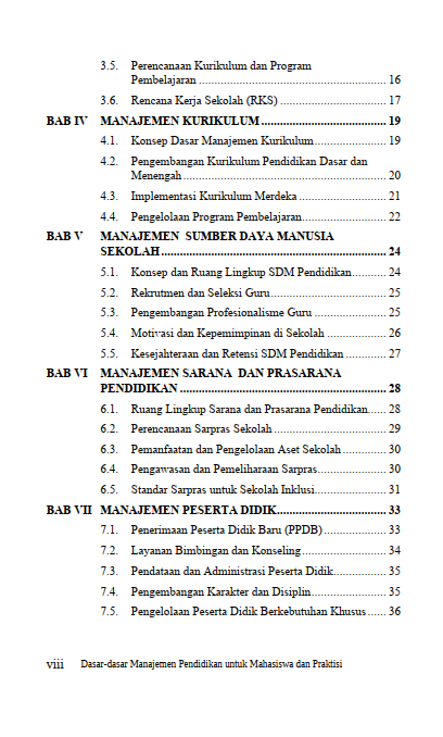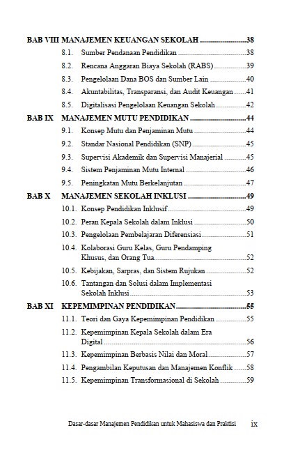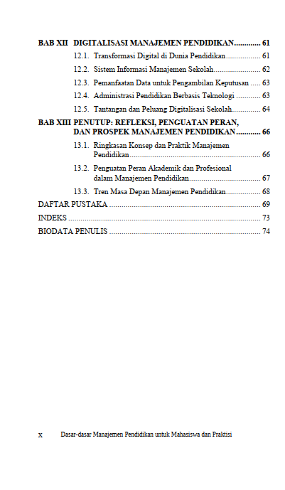 Keunggulan sebuah institusi pendidikan tidak lahir dari ruang hampa, melainkan tumbuh dari komitmen terhadap penjaminan mutu dan kepemimpinan yang bervisi jauh ke depan. Standar layanan pendidikan yang inklusif diangkat sebagai wujud kepedulian untuk merangkul setiap potensi anak tanpa terkecuali, didukung oleh sinergi harmonis antara pendidik dan orang tua. Di tengah arus perubahan zaman, sosok pemimpin sekolah yang transformasional dan berbasis nilai moral diposisikan sebagai nakhoda yang mampu menavigasi konflik serta mendorong inovasi berkelanjutan. Gelombang digitalisasi yang kini mengubah wajah administrasi dan sistem informasi ditangkap sebagai peluang strategis untuk mempercepat pengambilan keputusan berbasis fakta. Seluruh ragam tantangan dan potensi masa depan ini dirangkai dalam satu kesatuan yang mengundang pembaca untuk menyelami seni mengelola pendidikan di era baru yang penuh harapan.