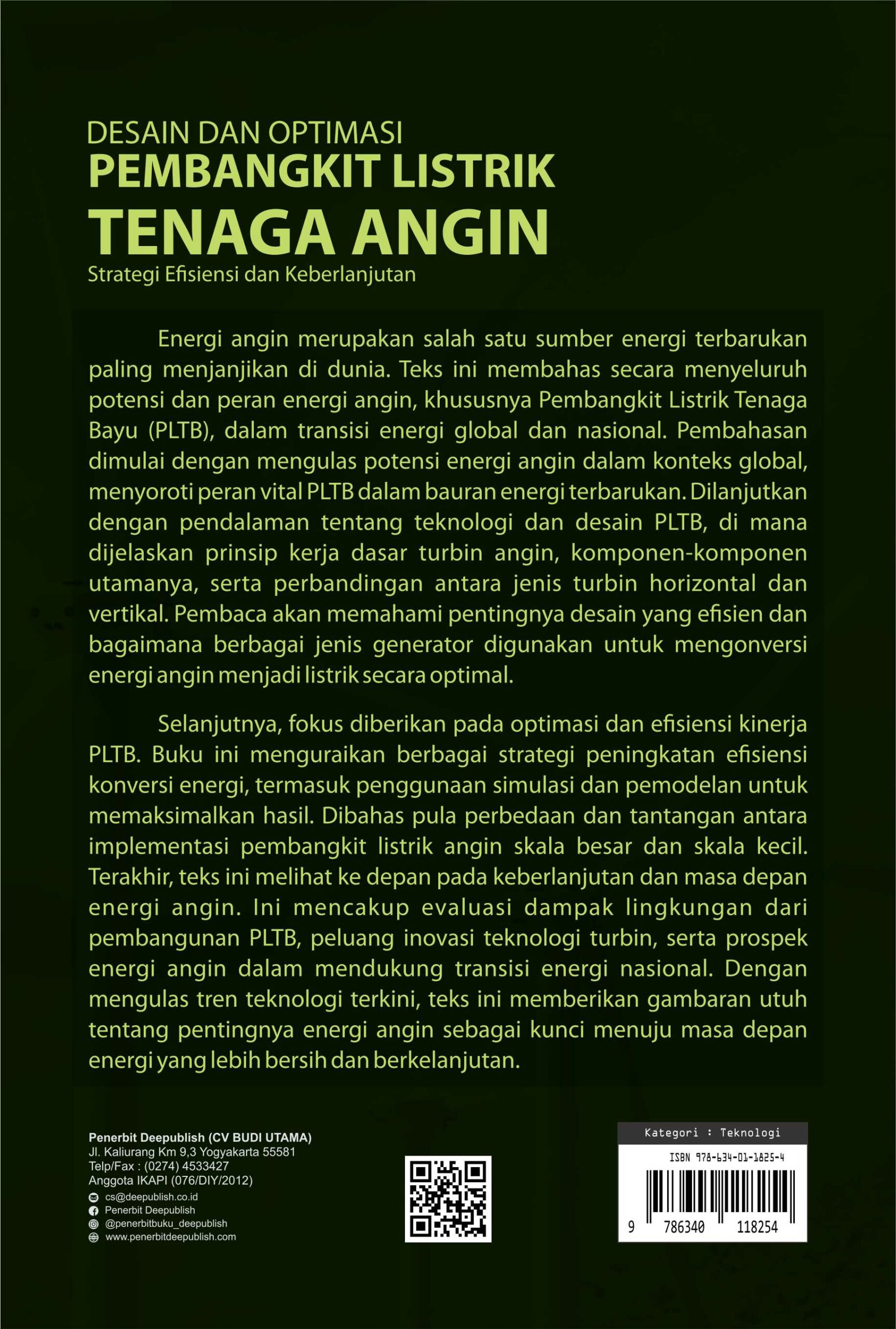Buku Desain dan Optimasi Pembangkit Listrik Tenaga Angin Strategi Efisiensi dan Keberlanjutan diterbitkan oleh Penerbit Buku Pendidikan Deepublish.