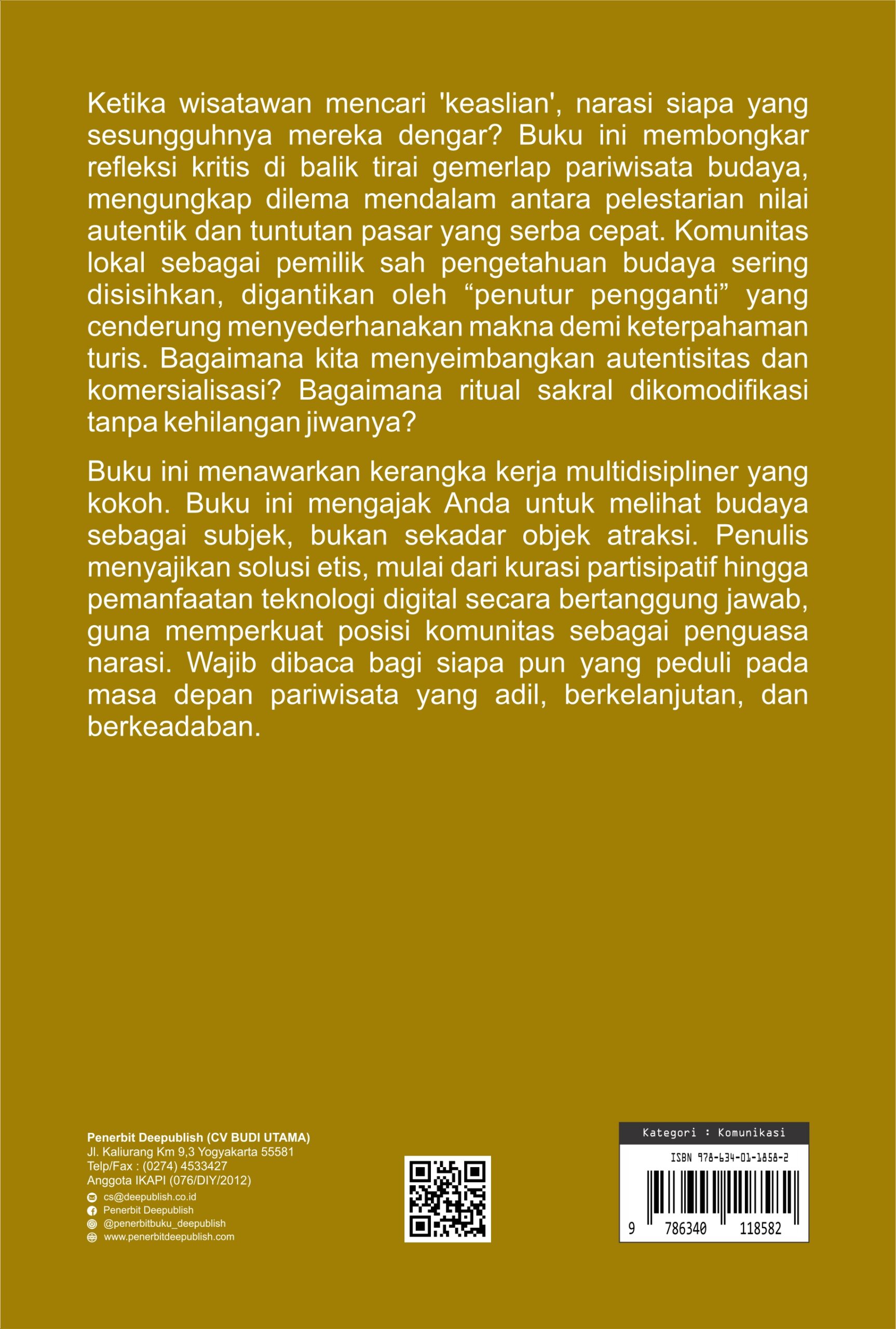 Buku Dilema Penutur dalam Pariwisata Budaya Strategi Komunikasi dan Literasi Komunitas di Era Digital diterbitkan oleh Penerbit Buku Pendidikan Deepublish.