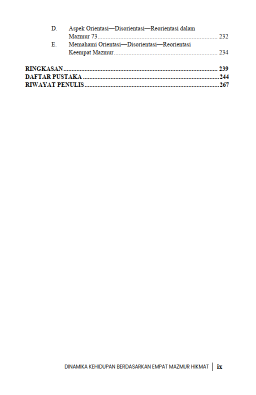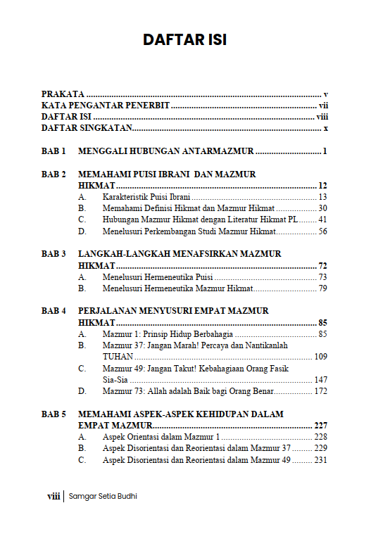 Buku ini mengupas makna mendalam dari Mazmur 1, 37, 49, dan 73 melalui paradigma orientasi—disorientasi—reorientasi. Dengan pendekatan teologi biblika dan prosedur hermeneutika, dilakukan pendalaman mengenai aspek-aspek dalam konteks Puisi Ibrani dan literatur hikmat Perjanjian Lama.
