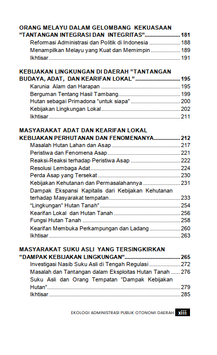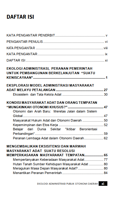 Buku ini mengajak pembaca untuk merenungkan pengalaman dan peristiwa di sekitar kita, serta mempertanyakan apakah cita-cita luhur pembangunan berkelanjutan sudah tercapai. Di dalamnya, terdapat deskripsi tentang ancaman nyata terhadap budaya, adat istiadat, dan kearifan lokal akibat ekspansi pemodal yang mengeksploitasi sumber daya alam. Buku ini menantang kita untuk mempertimbangkan jenis kebijakan yang sedang dipraktikkan dan apakah kebijakan tersebut benar-benar mendukung ekologi administrasi publik yang positif dan berkelanjutan. Target reformasi administrasi publik berkelanjutan adalah memberantas kemiskinan dan menciptakan keadilan sosial, tentunya sejalan dengan sila ke lima Pancasila Keadilan Sosial bagi seluruh rakyat Indonesia. Misi administrasi publik jelas:” mendedikasikan diri untuk kepentingan rakyat “public interest”.