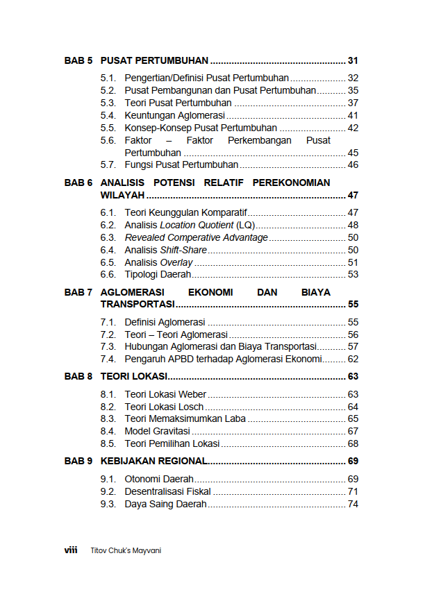 Buku Ekonomi yang berjudul Buku Ekonomi Regional Teori dan Aplikasi merupakan karya Titov Chuk’s Mayvani. Perekonomian regional adalah ilmu baru dalam ekonomi. Namun, seiring pertumbuhan yang fenomenal ini, Ekonomi Regional telah menjadi sebuah ilmu yang dipelajari dalam universitas setelah berkonferensi dengan ilmu ekonomi internasional, dalam jurnal ekonomi yang di pelajari, dan dalam pemikiran lembaga pembuat kebijakan dan perencanaan komisi. Pendefinisian masalah ekonomi regional dapat dilakukan dengan menelaah upaya pemecahannya. Ilmu regional, yang terintegrasi dari berbagai disiplin seperti geografi, ekonomi, sosiologi, dan demografi, memandang masalah regional sejajar dengan solusi yang diterapkan. Namun, mengklasifikasikan kajian regional sulit karena sifatnya yang multidimensional. Cara yang lebih baik mungkin terletak pada sudut pandang ekonomi itu sendiri, bukan pada materi spesifik. Jika ekonomi regional dipahami sebagai pembelajaran aspek ekonomi dari seluruh aktivitas manusia dalam konteks wilayah, maka analisis ekonomi daerah menjadi bagian integral dari ilmu regional.