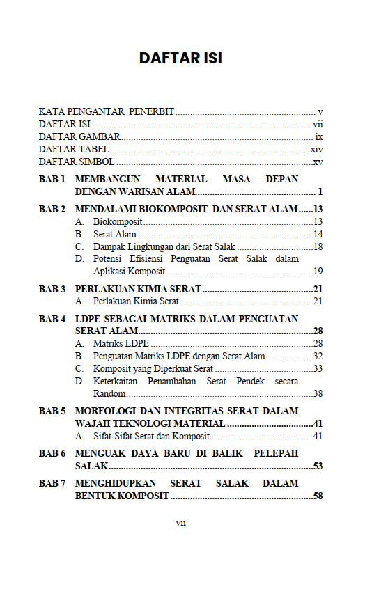 Berikut Daftar Isi Buku Teknik yang berjudul Buku Eksplorasi Komposit Ramah Lingkungan Bermatriks LDPE dengan Penguat Serat Alami dari Pelepah Salak, diantaranya: