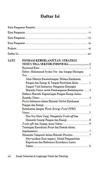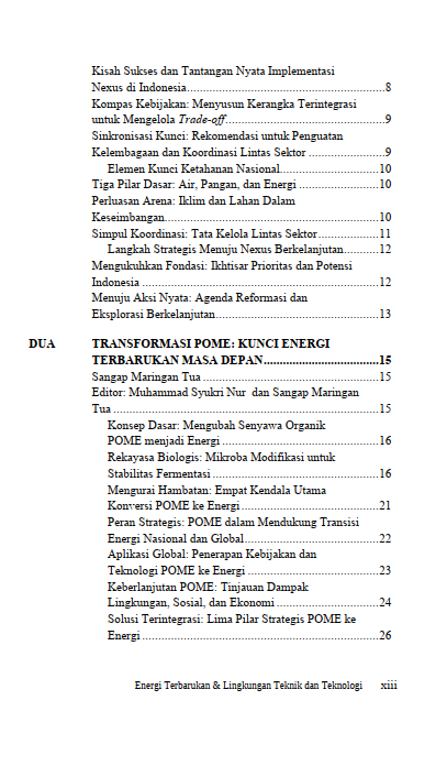 Setiap bab dalam buku ini menggali keterkaitan erat antara sektor energi, air, dan pangan (nexus tiga sektor) sebagai dasar pengelolaan sumber daya yang efisien dan berkelanjutan. Pembahasan tentang POME (Palm Oil Mill Effluent) menyoroti potensi limbah industri kelapa sawit sebagai sumber energi terbarukan yang belum banyak dimanfaatkan. Di sisi lain, topik kebijakan biomassa menegaskan pentingnya peran regulasi dalam mendorong pemanfaatan sumber energi hayati sebagai alternatif pengganti bahan bakar fosil.