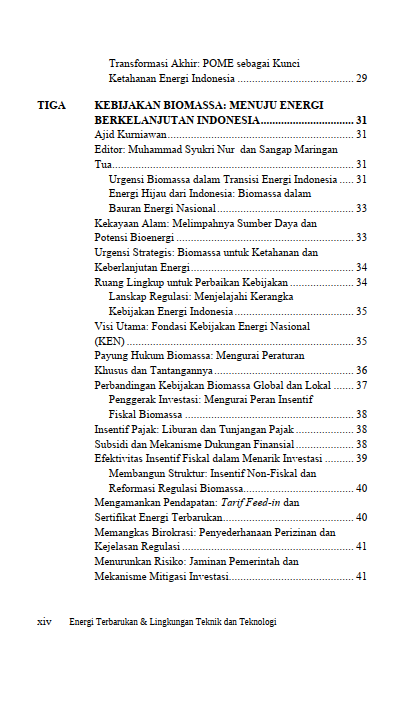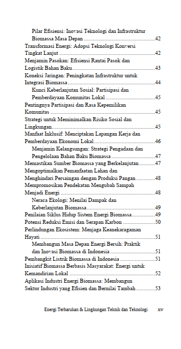 Buku Energi Terbarukan dan Lingkungan: Teknik dan Teknologi mengulas arah baru pembangunan energi berkelanjutan di Indonesia. Melalui pembahasan lima tema utama; Fondasi Keberlanjutan: Strategi Nexus Tiga Sektor Indonesia, Transformasi POME: Kunci Energi Terbarukan Masa Depan, Kebijakan Biomassa: Menuju Energi Berkelanjutan Indonesia, Reklamasi Hijau Pascatambang: Strategi Biochar Berbasis Industri Sagu Terpadu, dan Transisi Energi: Menuju Sistem Energi Berkelanjutan, buku ini menghadirkan uraian integratif antara teknologi, lingkungan, dan kebijakan nasional.