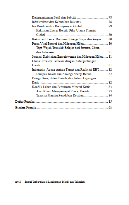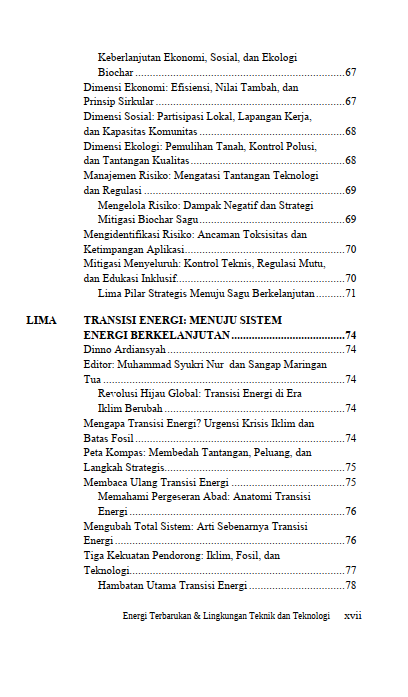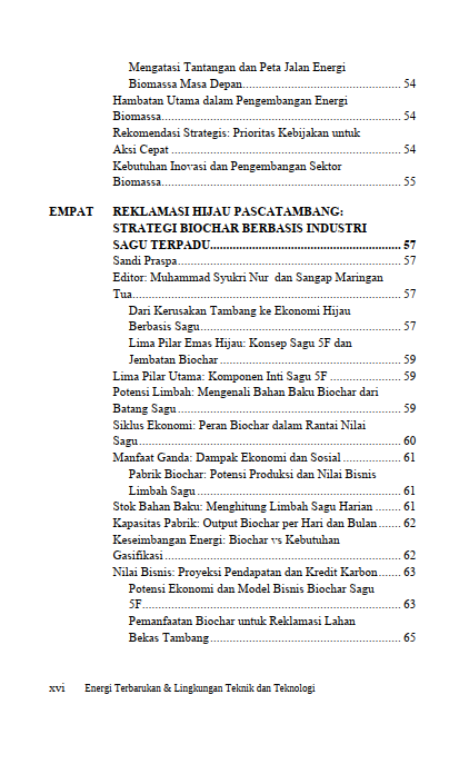 Buku ini juga membahas strategi reklamasi hijau pascatambang melalui teknologi biochar yang inovatif berbasis industri sagu terpadu, sebagai upaya rehabilitasi lahan sekaligus produksi energi ramah lingkungan. Pada akhirnya, pembahasan transisi energi menguraikan langkah-langkah strategis menuju sistem energi nasional yang rendah emisi dan adaptif terhadap perubahan iklim.