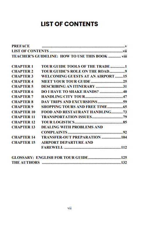 Berikut Daftar Isi Buku Bahasa Inggris yang berjudul Buku English for Tour Guide, diantaranya: