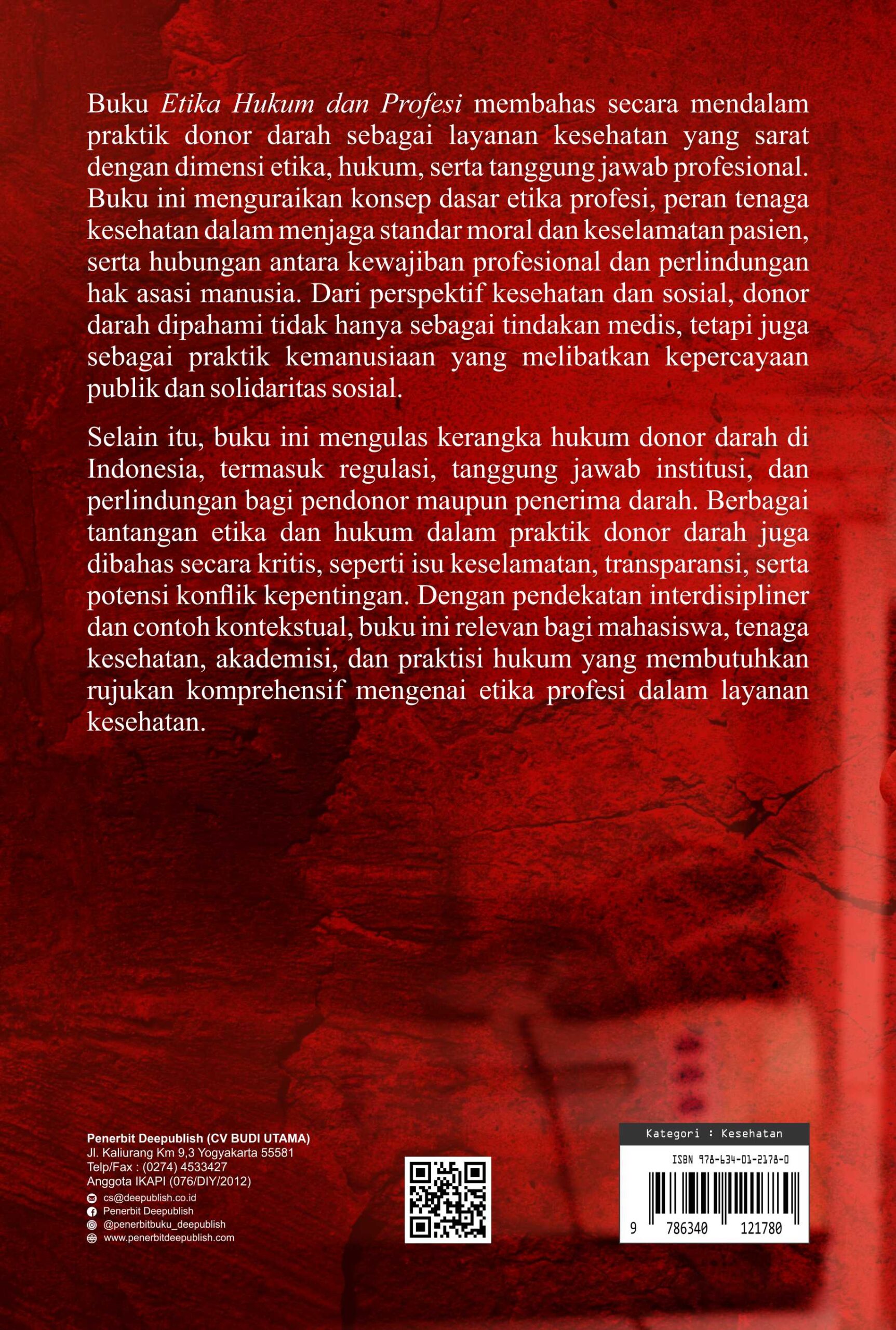 Selain itu, buku ini mengulas kerangka hukum donor darah di Indonesia, termasuk regulasi, tanggung jawab institusi, dan perlindungan bagi pendonor maupun penerima darah. Berbagai tantangan etika dan hukum dalam praktik donor darah juga dibahas secara kritis, seperti isu keselamatan, transparansi, serta potensi konflik kepentingan. Dengan pendekatan interdisipliner dan contoh kontekstual, Buku Etika Hukum dan Profesi ini relevan bagi mahasiswa, tenaga kesehatan, akademisi, dan praktisi hukum yang membutuhkan rujukan komprehensif mengenai etika profesi dalam layanan kesehatan.