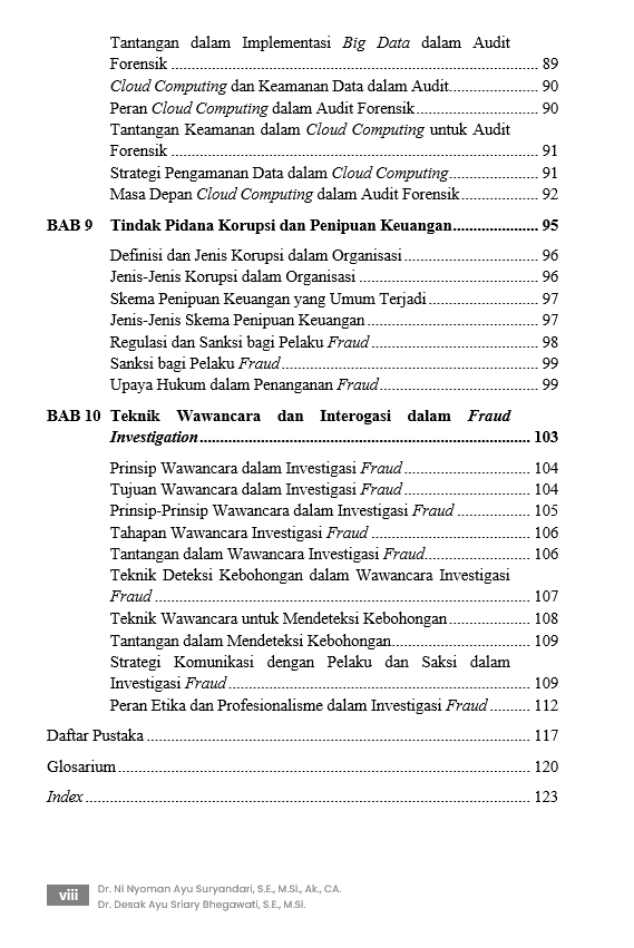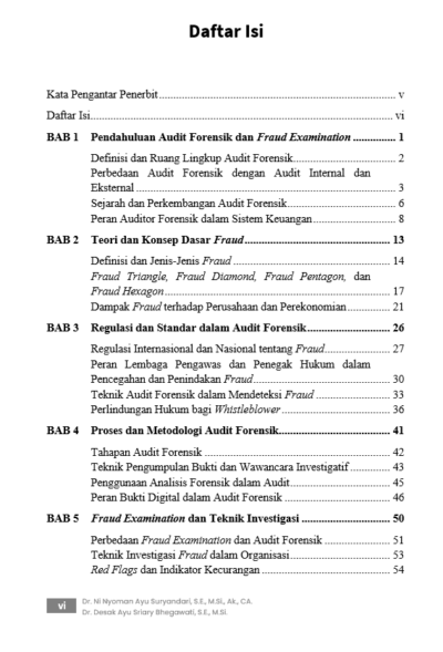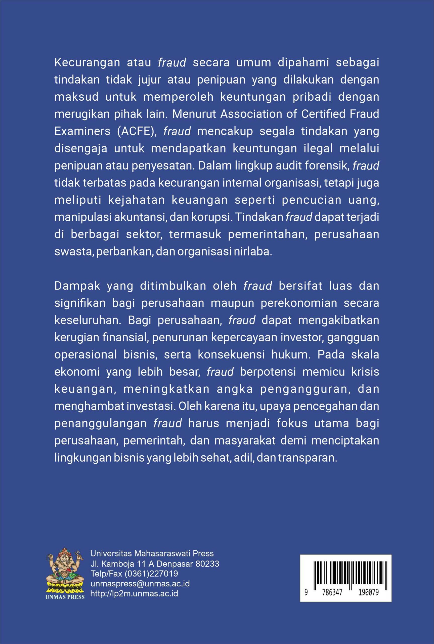 Sinopsis Buku Fraud Examination Dan Audit Investigatif: Teori Hingga Implementasi Buku Fraud Examination Dan Audit Investigatif: Teori Hingga Implementasi  Buku Manajemen yang berjudul Buku Fraud Examination Dan Audit Investigatif: Teori Hingga Implementasi merupakan karya Ni Nyoman Ayu Suryandari dan Desak Ayu Sriary Bhegawati. Buku ini mengupas tuntas konsep fraud, definisinya menurut ACFE, dan cakupannya dalam audit forensik, termasuk kejahatan keuangan. Dibahas pula dampak serius fraud bagi perusahaan dan perekonomian, menekankan pentingnya pencegahan dan penanggulangan. Buku ini menyajikan teori fraud examination dan audit investigatif secara komprehensif, dilengkapi studi kasus implementasi untuk menciptakan lingkungan bisnis yang transparan dan terpercaya. Cocok bagi auditor, akuntan forensik, dan profesional yang peduli pada integritas keuangan. Kecurangan atau fraud secara umum dipahami sebagai tindakan tidak jujur atau penipuan yang dilakukan dengan maksud untuk memperoleh keuntungan pribadi dengan merugikan pihak lain. Menurut Association of Certified Fraud Examiners (ACFE), fraud mencakup segala tindakan yang disengaja untuk mendapatkan keuntungan ilegal melalui penipuan atau penyesatan. Dalam lingkup audit forensik, fraud tidak terbatas pada kecurangan internal organisasi, tetapi juga meliputi kejahatan keuangan seperti pencucian uang, manipulasi akuntansi, dan korupsi. Tindakan fraud dapat terjadi di berbagai sektor, termasuk pemerintahan, perusahaan swasta, perbankan, dan organisasi nirlaba. Dampak yang ditimbulkan oleh fraud bersifat luas dan signifikan bagi perusahaan maupun perekonomian secara keseluruhan. Bagi perusahaan, fraud dapat mengakibatkan kerugian finansial, penurunan kepercayaan investor, gangguan operasional bisnis, serta konsekuensi hukum. Pada skala ekonomi yang lebih besar, fraud berpotensi memicu krisis keuangan, meningkatkan angka pengangguran, dan menghambat investasi. Oleh karena itu, upaya pencegahan dan penanggulangan fraud harus menjadi fokus utama bagi perusahaan, pemerintah, dan masyarakat demi menciptakan lingkungan bisnis yang lebih sehat, adil, dan transparan. Berikut Daftar Isi Buku Manajemen yang berjudul Buku Fraud Examination Dan Audit Investigatif: Teori Hingga Implementasi, diantaranya: