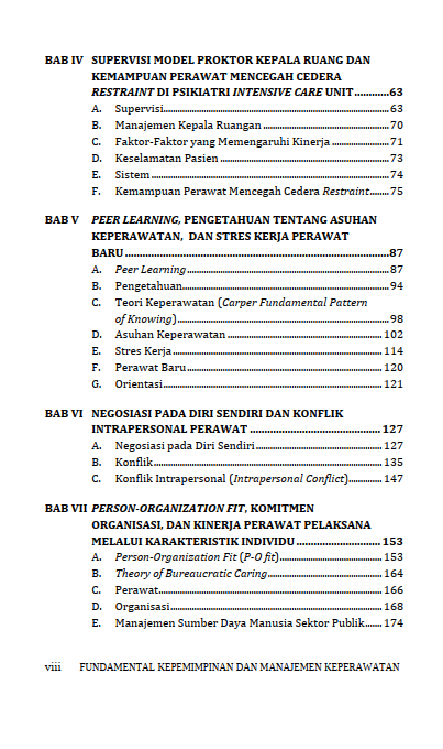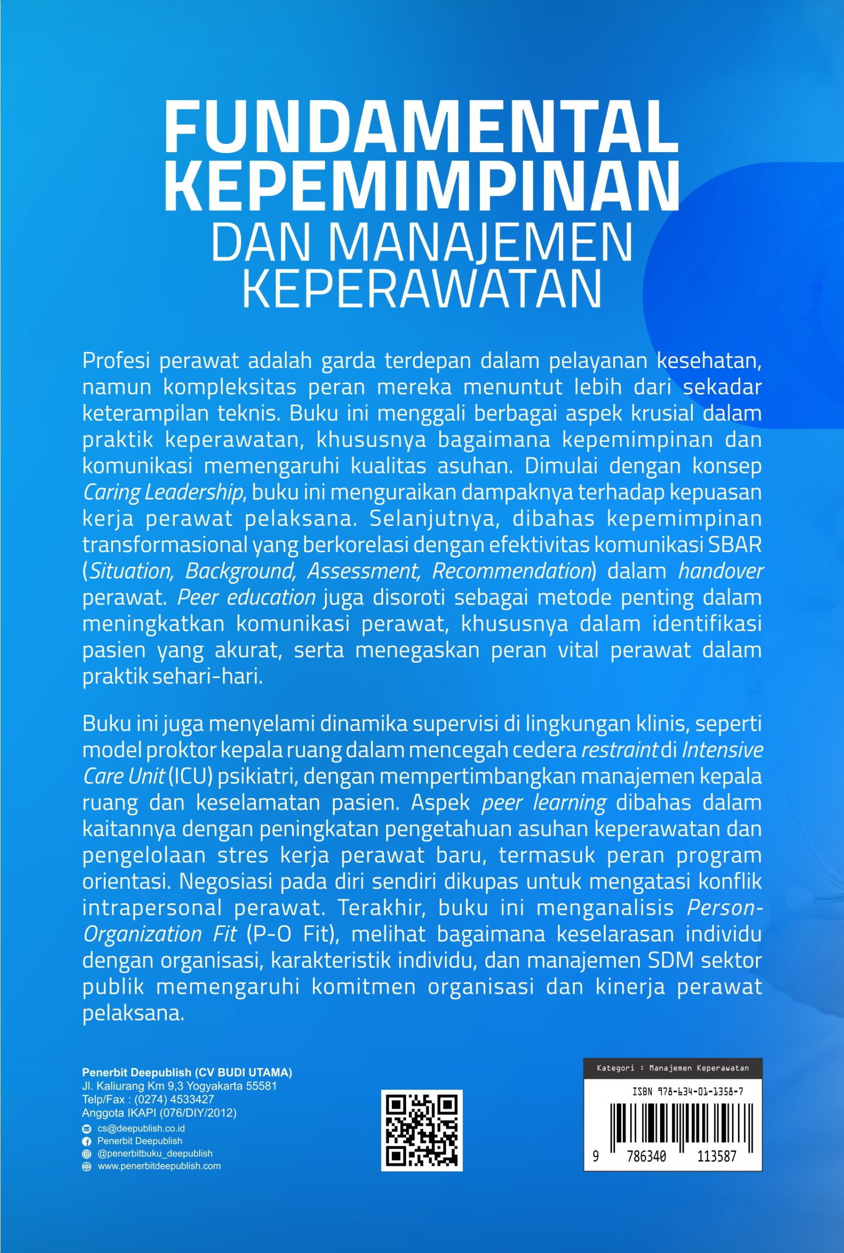Buku ini juga menyelami dinamika supervisi di lingkungan klinis, seperti model proktor kepala ruang dalam mencegah cedera restraint di Intensive Care Unit (ICU) psikiatri, dengan mempertimbangkan manajemen kepala ruang dan keselamatan pasien. Aspek peer learning dibahas dalam kaitannya dengan peningkatan pengetahuan asuhan keperawatan dan pengelolaan stres kerja perawat baru, termasuk peran program orientasi. Negosiasi pada diri sendiri dikupas untuk mengatasi konflik intrapersonal perawat. Terakhir, buku ini menganalisis Person-Organization Fit (P-O Fit), melihat bagaimana keselarasan individu dengan organisasi, karakteristik individu, dan manajemen SDM sektor publik memengaruhi komitmen organisasi dan kinerja perawat pelaksana. Buku Fundamental Kepemimpinan dan Manajemen Keperawatan sangat cocok bagi para peneliti, mahasiswa, dan praktisi di bidang keperawatan yang ingin mendalami berbagai aspek krusial dalam praktik keperawatan, khususnya bagaimana kepemimpinan dan komunikasi memengaruhi kualitas asuhan.