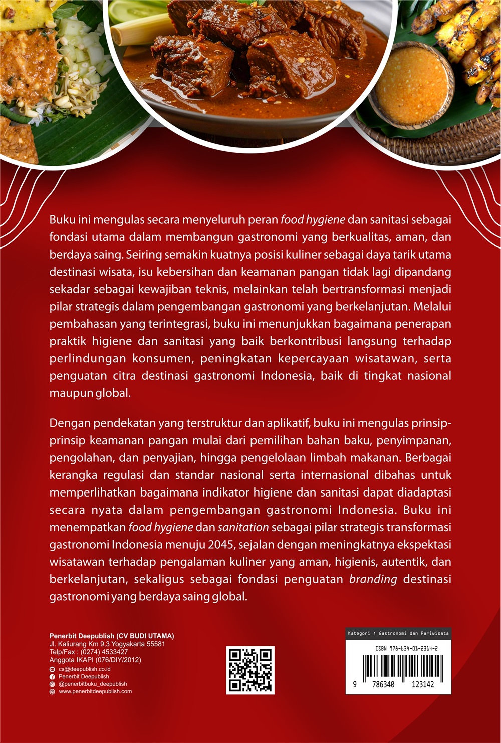 Dengan pendekatan yang terstruktur dan aplikatif, buku ini mengulas prinsip-prinsip keamanan pangan mulai dari pemilihan bahan baku, penyimpanan, pengolahan, dan penyajian, hingga pengelolaan limbah makanan. Berbagai kerangka regulasi dan standar nasional serta internasional dibahas untuk memperlihatkan bagaimana indikator higiene dan sanitasi dapat diadaptasi secara nyata dalam pengembangan gastronomi Indonesia. Buku ini menempatkan food hygiene dan sanitation sebagai pilar strategis transformasi gastronomi Indonesia menuju 2045, sejalan dengan meningkatnya ekspektasi wisatawan terhadap pengalaman kuliner yang aman, higienis, autentik, dan berkelanjutan, sekaligus sebagai fondasi penguatan branding destinasi gastronomi yang berdaya saing global. Buku Gastronomi Food Hygiene & Sanitation Memastikan Kualitas, Mencegah Kontaminasi ini adalah panduan strategis yang wajib dimiliki oleh setiap pelaku industri pariwisata, pengusaha kuliner, hingga akademisi. Terbagi ke dalam enam bab, buku ini membongkar ancaman keamanan pangan, mulai dari tingkat personal (higienis) hingga implementasi sistem manajemen keamanan pangan (FSMS) pada skala destinasi. Pembaca akan mempelajari teknik penanganan bahan baku yang aman dan strategi sanitasi lingkungan yang efektif yang sukses menjadikan food hygiene sebagai investasi, bukan sekadar biaya.