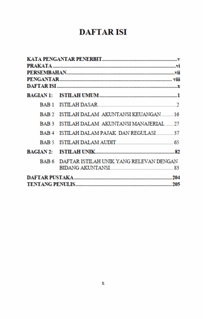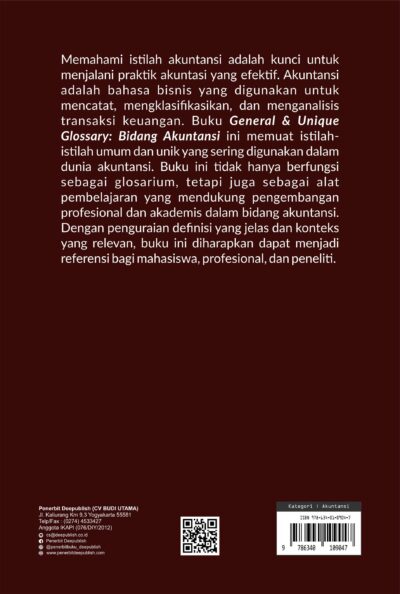 Sinopsis Buku General & Unique Glossary: Bidang Akuntansi Buku General & Unique Glossary: Bidang Akuntansi Buku Akuntansi yang berjudul Buku General & Unique Glossary: Bidang Akuntansi merupakan karya Diyah Probowulan. Memahami istilah akuntansi adalah kunci untuk menjalani praktik akuntasi yang efektif. Dalam dunia akuntansi, pemahaman istilah dasar adalah fundamental untuk memahami konsep yang lebih kompleks. Istilah-istilah ini membentuk fondasi bagi praktik akuntansi dan membantu individu berkomunikasi secara efektif dalam konteks keuangan. Akuntansi adalah bahasa bisnis yang digunakan untuk mencatat, mengklasifikasikan, dan menganalisis transaksi keuangan. Buku ini memuat istilah-istilah umum dan unik yang sering digunakan dalam dunia akuntansi. Buku ini tidak hanya berfungsi sebagai glosarium, tetapi juga sebagai alat pembelajaran yang mendukung pengembangan profesional dan akademis dalam bidang akuntansi. Dengan penguraian definisi yang jelas dan konteks yang relevan, buku ini diharapkan dapat menjadi referensi bagi mahasiswa, profesional, dan peneliti. Buku ini tidak hanya berfungsi sebagai glosarium, tetapi juga sebagai alat pembelajaran yang mendukung pengembangan profesional dan akademis dalam bidang akuntansi. Pembaca diharapkan dapat menggunakan buku ini sebagai panduan untuk memperluas pengetahuan dan keterampilan mereka dalam dunia akuntansi yang kompleks dan dinamis. Berikut Daftar Isi Buku Akuntansi yang berjudul Buku General & Unique Glossary: Bidang Akuntansi, diantaranya: