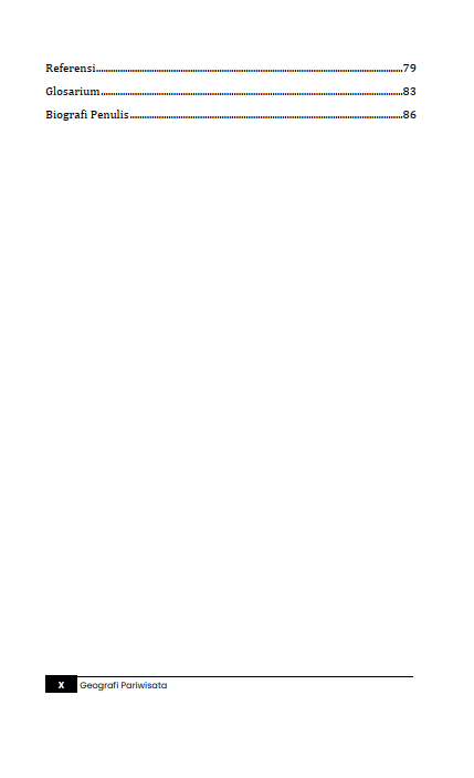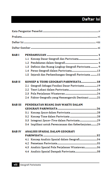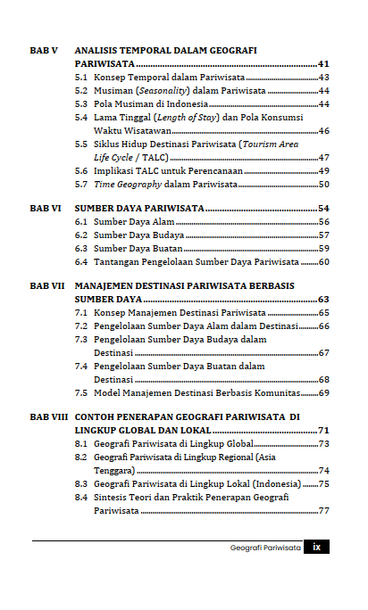 Berikut Daftar Isi Buku Pariwisata yang berjudul Buku Geografi Pariwisata: Konsep, Aplikasi, dan Keberlanjutan dalam Pembangunan Destinasi, diantaranya: