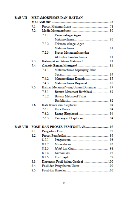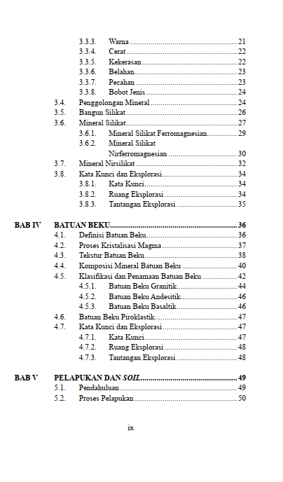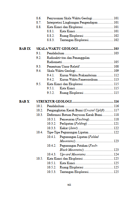 Penyimpanan sisa jasad makhluk hidup di dalam pelukan batuan senantiasa menjadi saksi bisu perjalanan peradaban dunia purbakala. Pembagian rentang waktu kejadian alam raya selalu memberikan kemudahan bagi pembacaan sejarah panjang pembentukan hamparan daratan. Pergeseran lempeng bumi berkekuatan raksasa terus membentuk ragam wujud patahan serta lipatan tanah di sepanjang wilayah. Pergerakan aliran air di atas permukaan daratan senantiasa menghidupkan urat nadi keseharian seluruh makhluk hidup setiap waktu. Penyimpanan cadangan mata air jernih di rongga bawah tanah terus memberikan jaminan bagi kelangsungan kesejahteraan generasi penerus masa depan. Penjabaran menyeluruh mengenai jejak kehidupan masa lalu, sejarah usia bumi, hingga siklus perputaran sumber air tersebut disajikan secara utuh di dalam buku ini. Keseluruhan rahasia tersembunyi alam raya ini sejatinya menjadi bekal pengetahuan demi merawat pelestarian lingkungan.