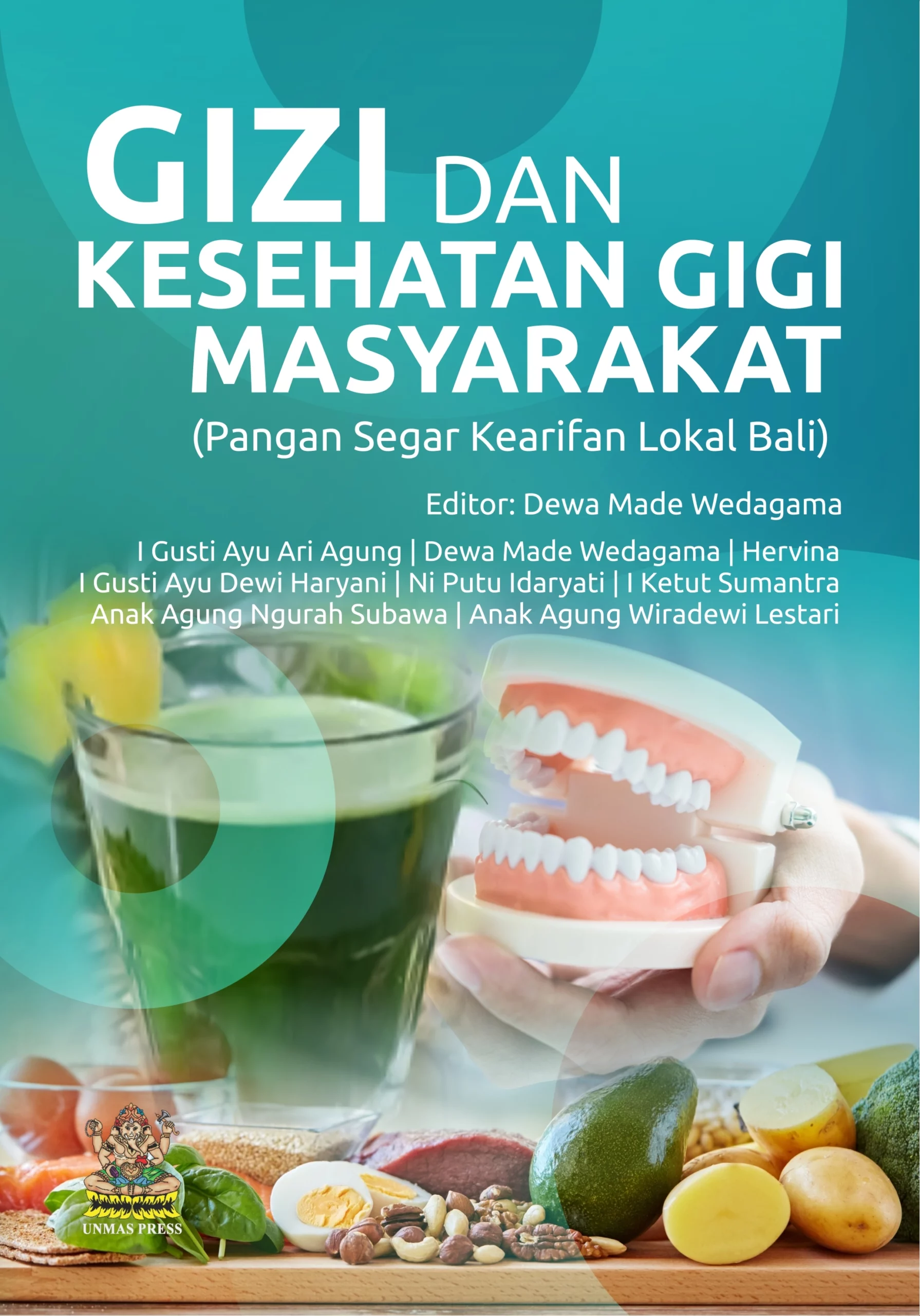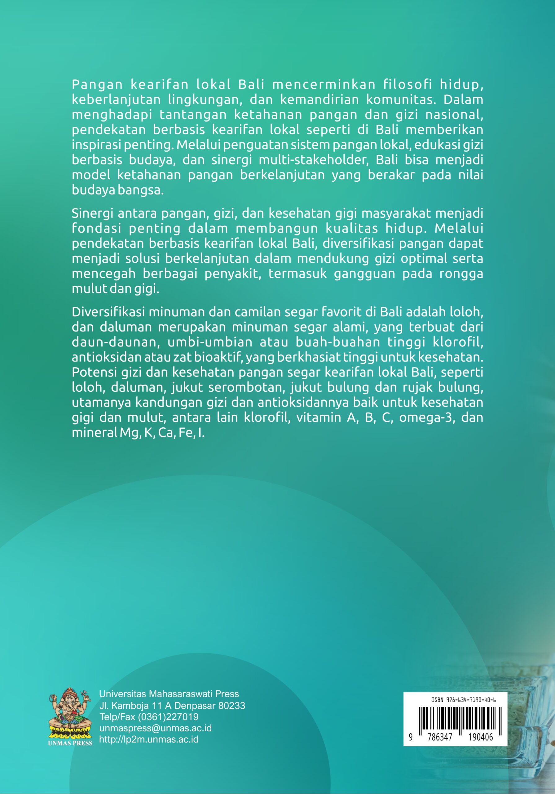 Sinergi antara pangan, gizi, dan kesehatan gigi masyarakat menjadi fondasi penting dalam membangun kualitas hidup. Melalui pendekatan berbasis kearifan lokal Bali, diversifikasi pangan dapat menjadi solusi berkelanjutan dalam mendukung gizi optimal serta mencegah berbagai penyakit, termasuk gangguan pada rongga mulut dan gigi. Diversifikasi minuman dan camilan segar favorit di Bali adalah loloh, dan daluman merupakan minuman segar alami, yang terbuat dari daun-daunan, umbi-umbian atau buah-buahan tinggi klorofil, antioksidan atau zat bioaktif, yang berkhasiat tinggi untuk kesehatan. Potensi gizi dan kesehatan pangan segar kearifan lokal Bali, seperti loloh, daluman, jukut serombotan, jukut bulung dan rujak bulung, utamanya kandungan gizi dan antioksidannya baik untuk kesehatan gigi dan mulut, antara lain klorofil, vitamin A, B, C, omega-3, dan mineral Mg, K, Ca, Fe, I. Buku Gizi dan Kesehatan Gigi Masyarakat (Pangan Segar Kearifan Lokal Bali) sangat cocok bagi para peneliti, mahasiswa, dan praktisi di bidang gizi, kesehatan gigi juga kesehatan masyarakat yang ingin meninjau pengertian maupun fungsi gizi, zat antigizi (keamanan pangan), kesehatan gigi dan mulut, serta permasalahan, dan upaya penanggulangannya dengan pangan segar kearifan lokal Bali.