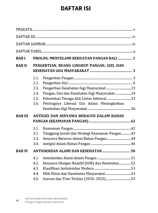 Berikut Daftar Isi Buku Kesehatan yang berjudul Buku Gizi dan Kesehatan Gigi Masyarakat (Pangan Segar Kearifan Lokal Bali), diantaranya: